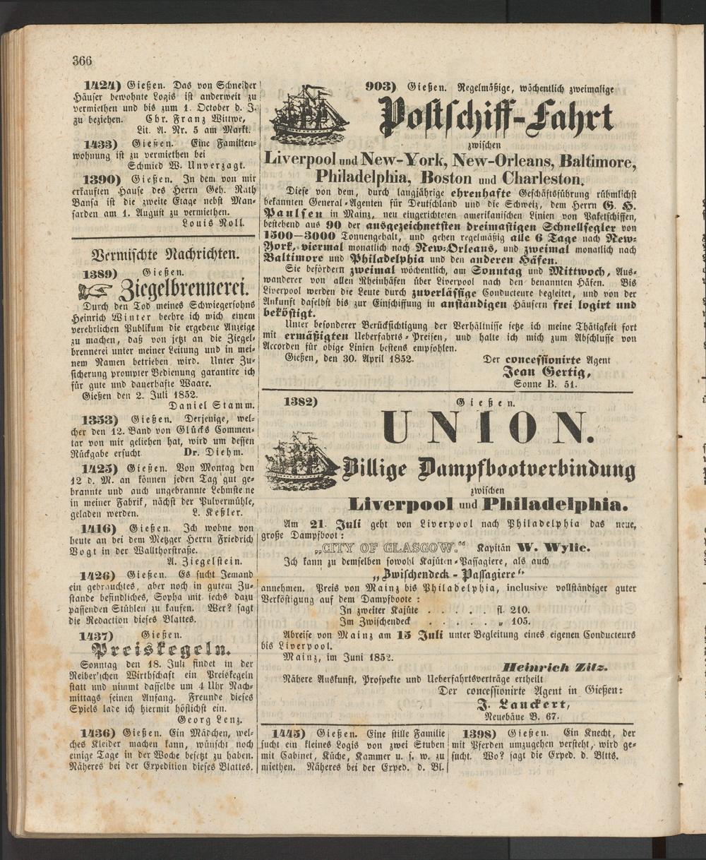 Sie befördern zweimal wöchentlich, am Sonntag und Mittwoch, Auswanderer von allen Rheinhäfen über Liverpool nach den benannte» Häfen. Bis Liverpool werden die Leute durch zuverlässige Conductenrc begleitet, und von der j Ankunft daselbst bis zur Einschiffung in anstäudiqen Häusern frei logirt und beköstigt.