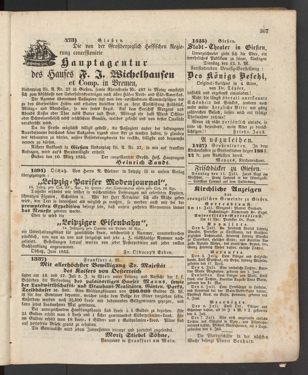 Lindenplatz Lil. A. Nr. 27 in Gießen, sowie Rheinstraße Nr. 497 in Mainz empfiehlt sich zum Abschlüsse von Ueberfahrtsverträgen nach allen Häfen Nord- und Süd-Amerikas.