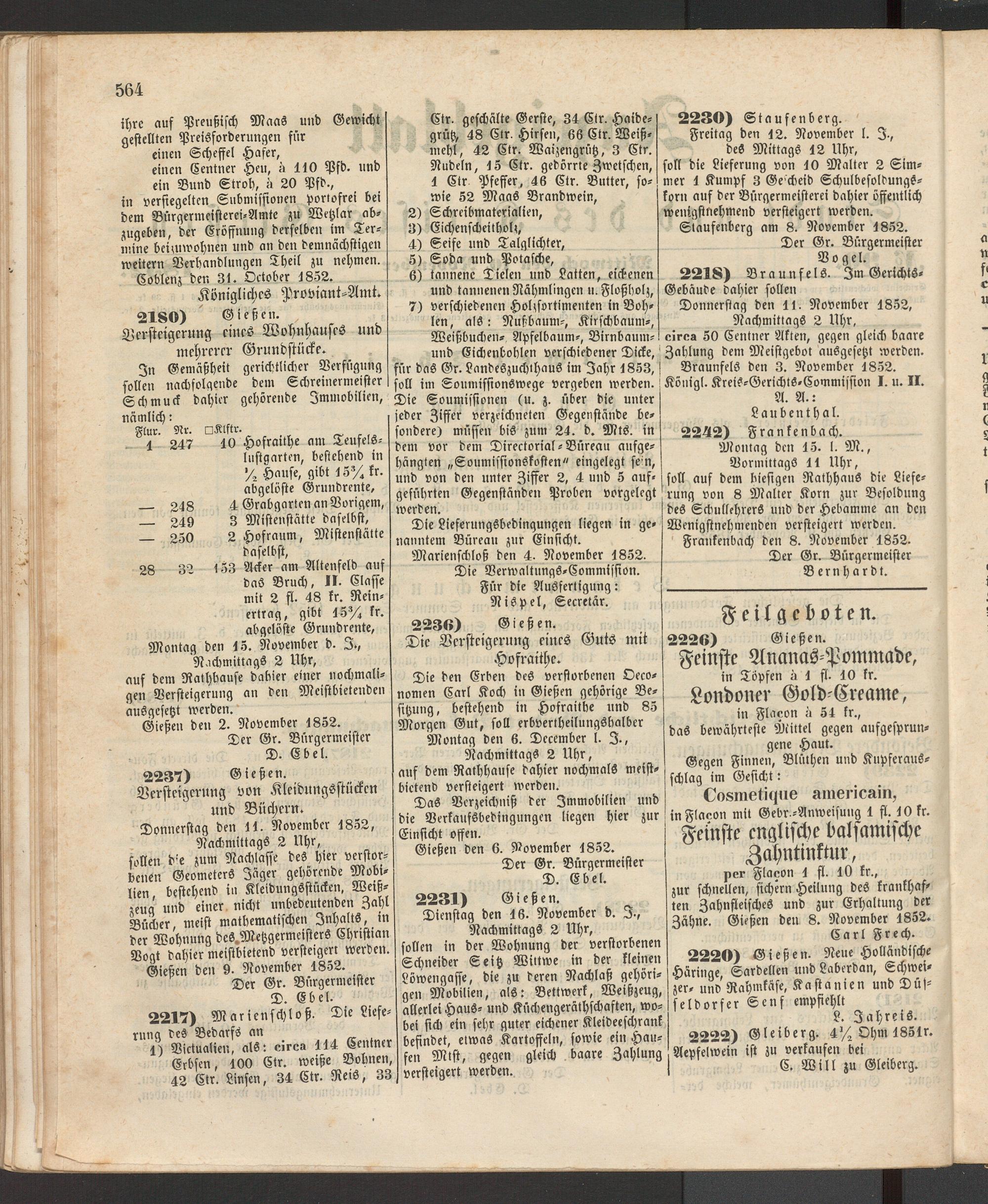 Cosmetique americain, in Flacon mit Gebr -Anweisung 1 fl. 10 fr. Feinste englische balsamische Zahntinktur, per Flacon 1 fl. 10 fr., zur schnellen, sichern Heilung des frankhaf- ten Zahnfleisches und zur Erhaltung der Zähne. Gießen den 8. November 1852. Carl Frech.