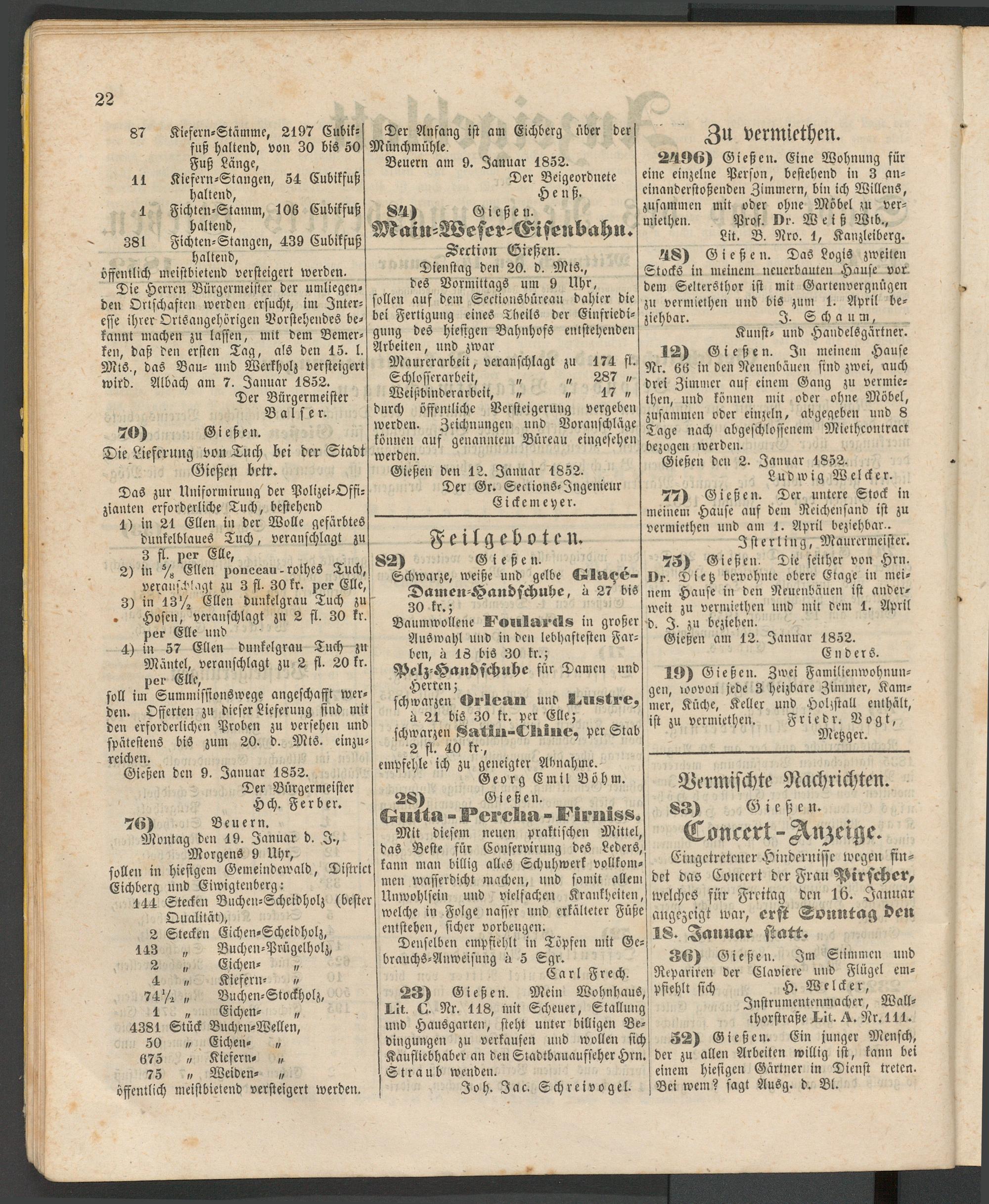 Die Herren Bürgermeister der umliegenden Ortschaften werden ersucht, im Interesse ihrer Ortsangehörigen Borstehendes bekannt machen zu lassen, mit dem Bemerken, daß den ersten Tag, als den 15. l. Mts., das Bau- und Werkhvlz versteigert wird. Albach am 7. Januar 1852.