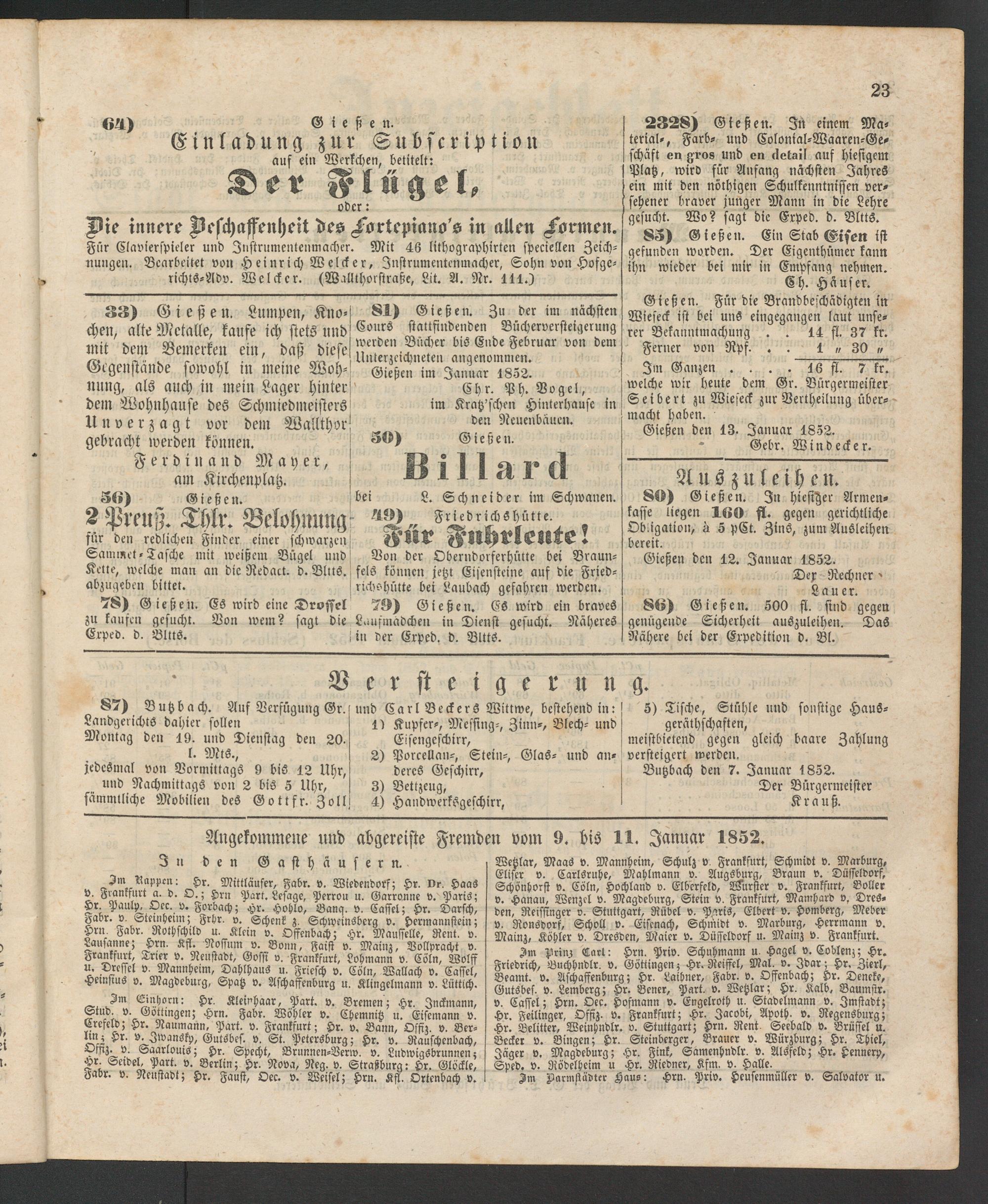 81) Gießen. Zu der im nächsten Cours stattfindenden Bücherversteigerung werden Bücher bis Ende Februar von dem Unterzeichneten angenommen.