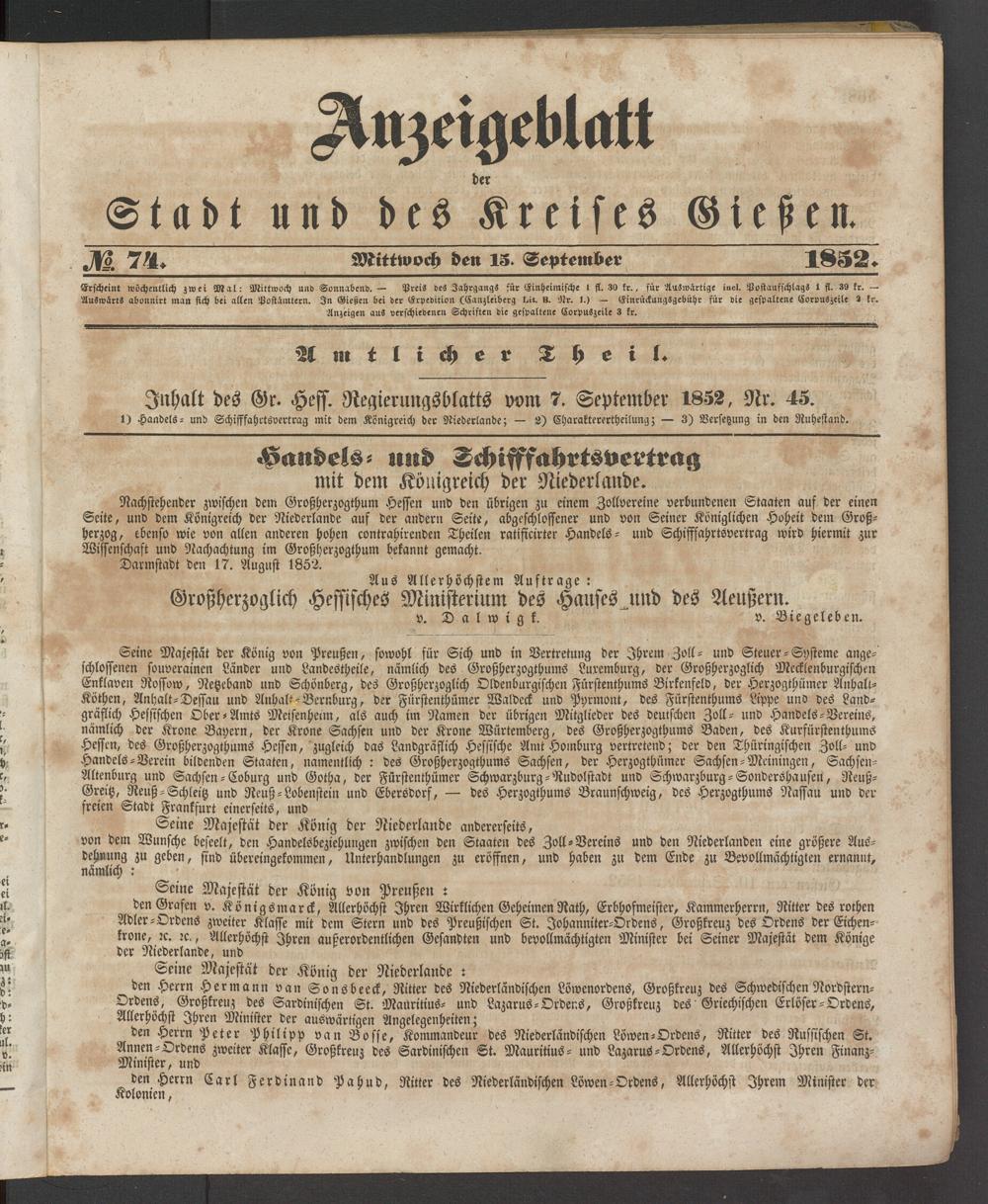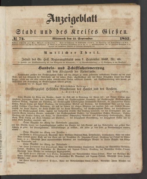 Nachstehender zwischen dem Großherzogthum Hessen und den übrigen zu einem Zollvereine verbundenen Staaten auf der einen Seite, und dem Königreich der Niederlande auf der andern Seite, abgeschlossener und von Seiner Königlichen Hoheit dem Großherzog, ebenso wie von allen anderen hohen contrahirenden Theilen ratificirter Handels- und Schiffsahrtövertrag wird hiermit zur Wissenschaft und Nachachtung im Großherzogthum bekannt gemacht.