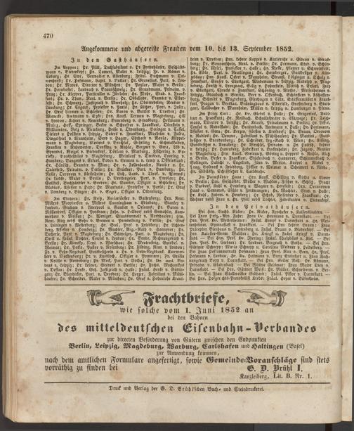 Angekommene und abgereiste Fremden vom 10. bis 13. September 1852.