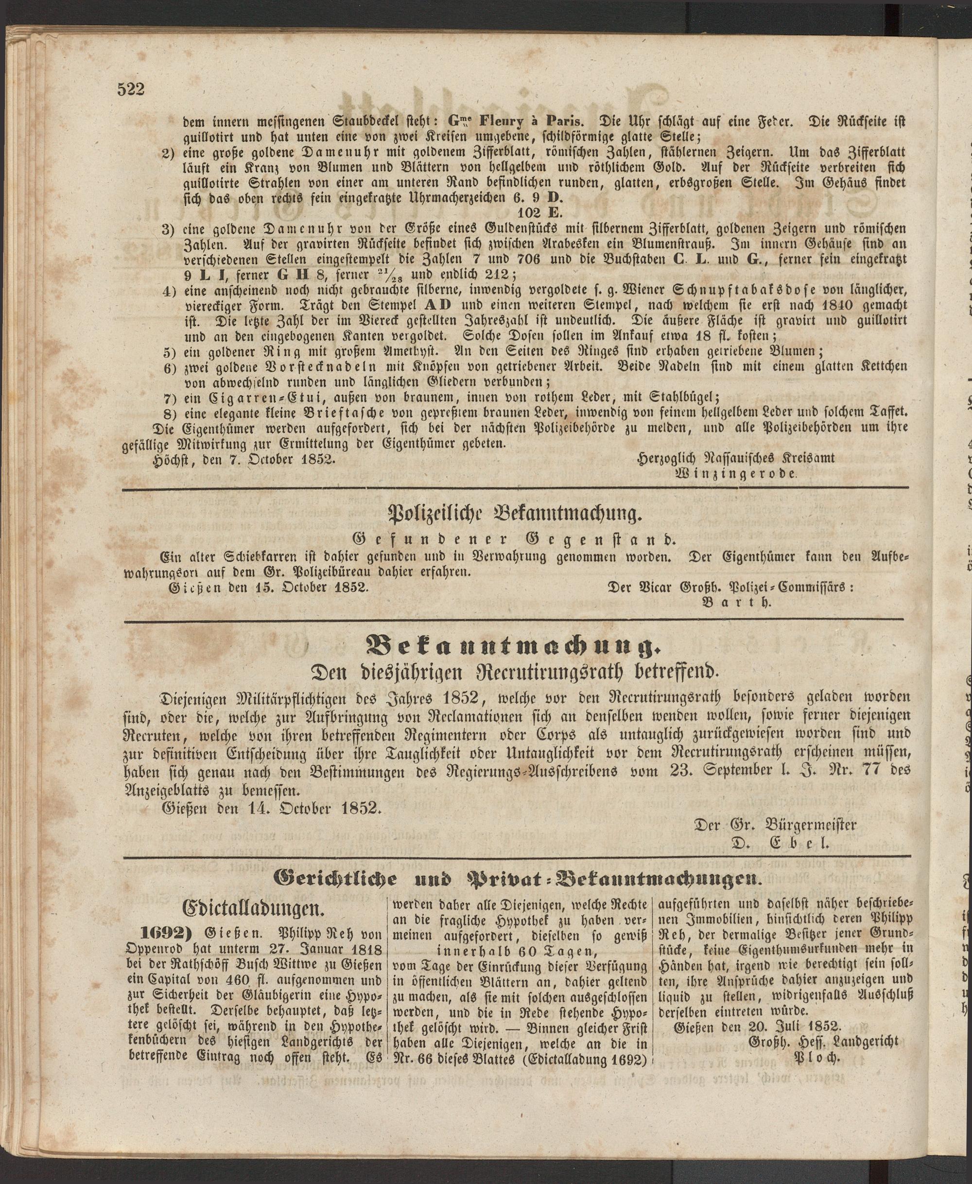 Gießen den 15. October 1852. Der Vicar Großb. Polizei - Commissärs :