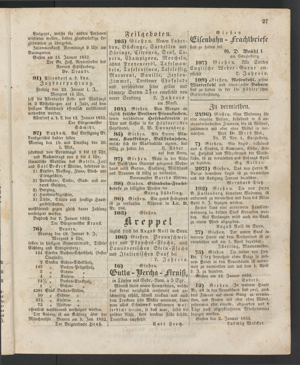 Gießen dett 2. Januar 1852.