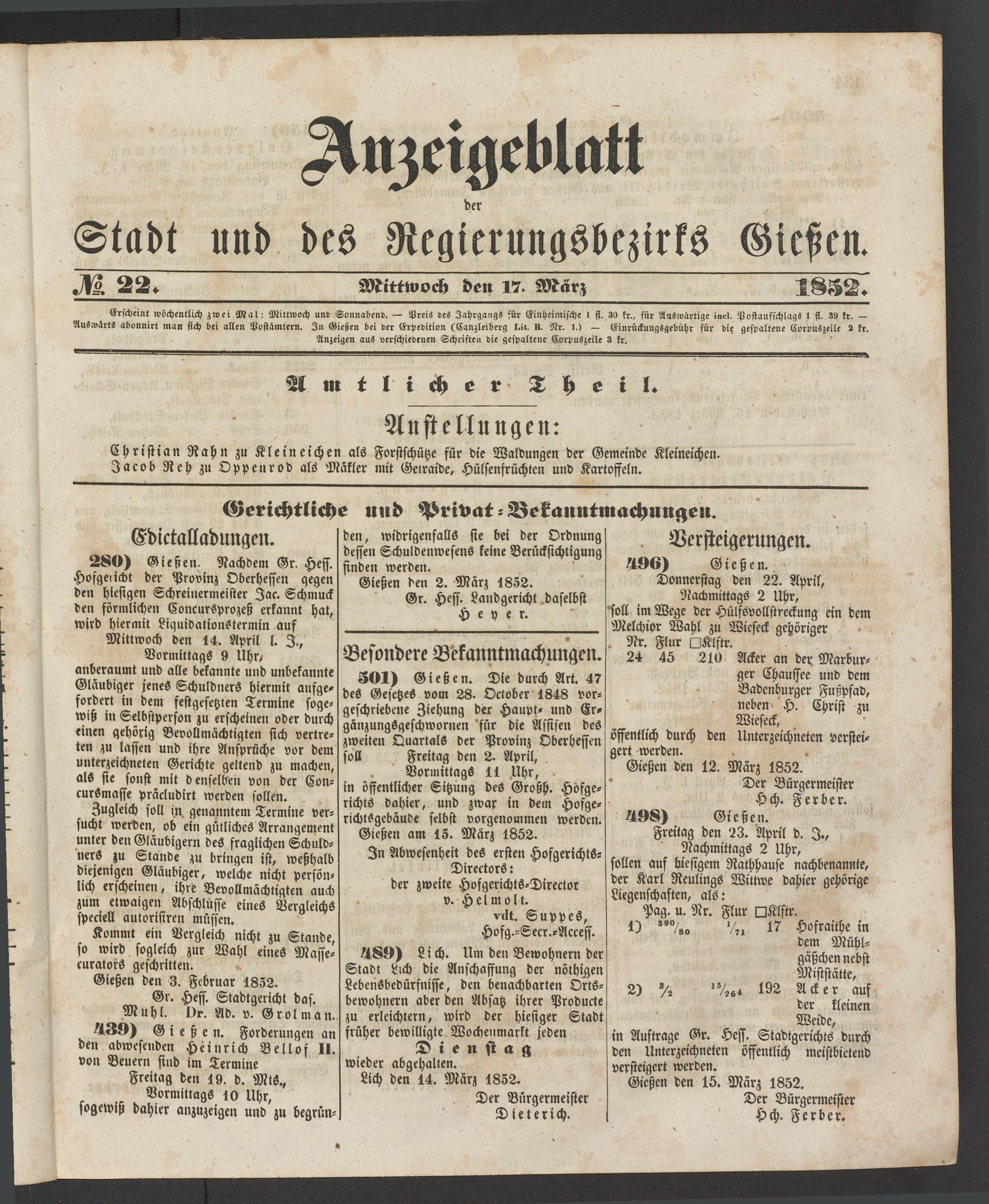 280) Gießen. Nachdem Gr. Hess. Hofgeiickt der Provinz Oberhessen gegen den hiesigen Schreinermeister Jac. Schmuck den förmlichen ConcurSprozeß erkannt hat, wird hiermit Liguidationstermin auf