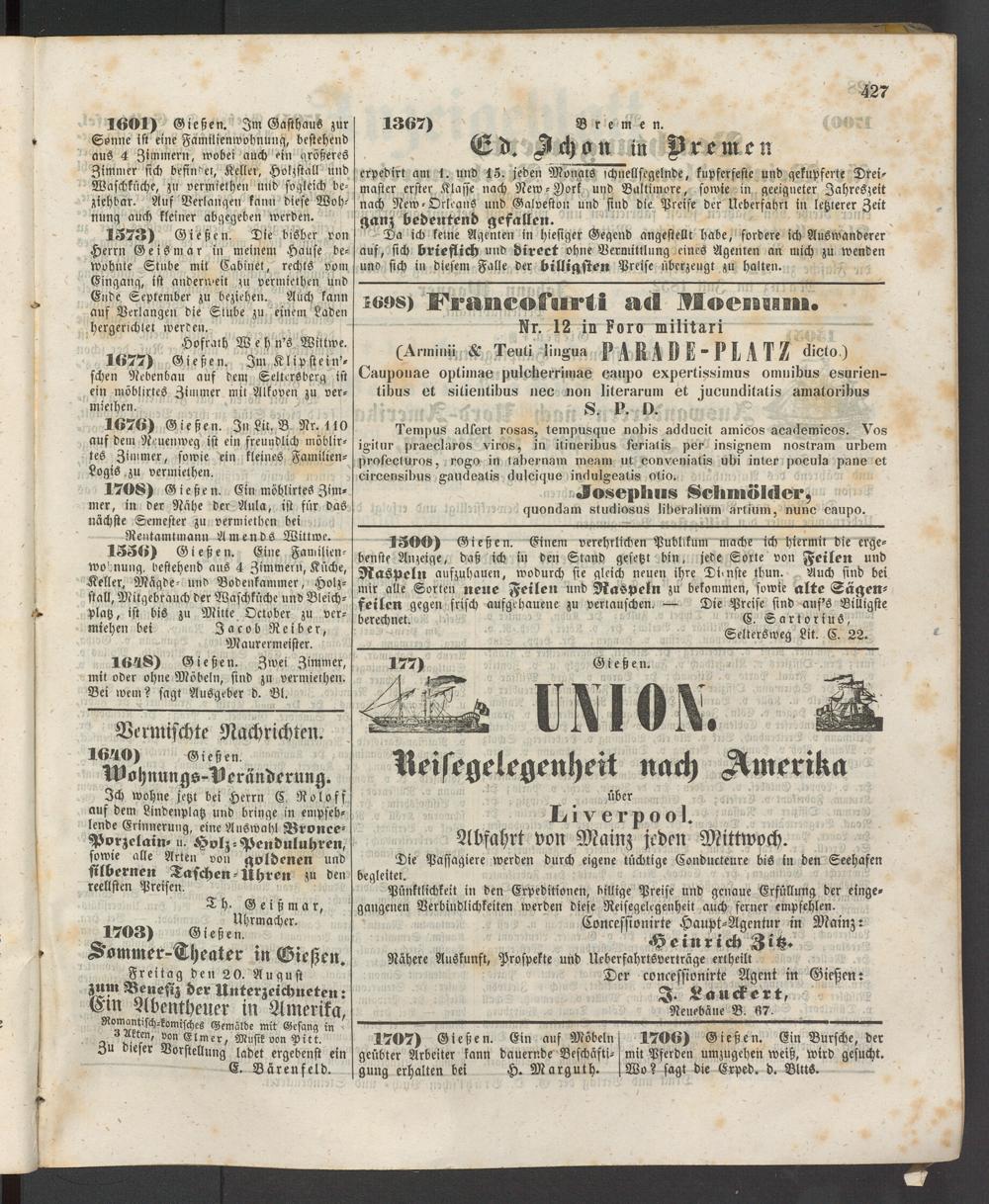 1601) Gießen. Im Gasthaus zur Sonne ist eine Familienwohnung, bestehend aus 4 Zimmern, wobei auch ein größeres Zimmer sich befindet, Keller, Holzstall und Waschküche, zu vermielhen und sogleich beziehbar. Auf Berlangen kann diese Wohnung auch kleiner abgegeben werden.