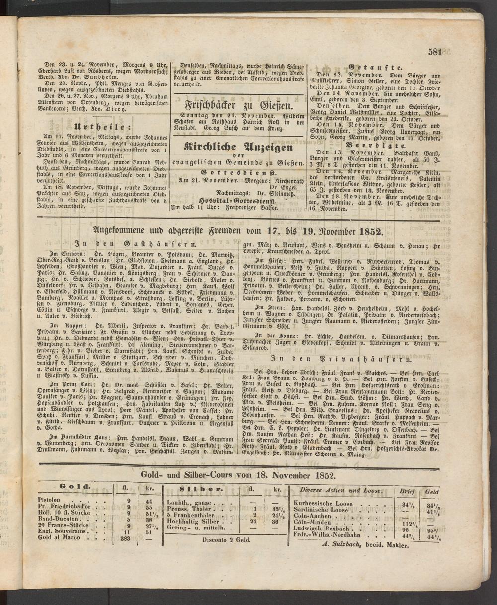 Im Hirsch: Hrn. Fubrl. Westrupp v. Ruppertenrod, Thomas v. Hommelshausen, Reitz v. Fulda, Ruppert v Schotten, Lofing v. Bingenheim u. Queckbörner v. Grünberg; Hrn. Handelsl. Rosenthal v. Cob- lenz, Börnes v. Frankfurt u. Guntrum v. Rothenburg; Hr. Hartmann, Privatm. v. Bellersheim; Hr. Haller, Uhrenh. v. Schwenningen; Hrn. Oeconomen Weber v. Hommelshausen, Schneider u. Dünger v. WallS- hausen; Hr. Fulder, Privatm. v. Schotten.