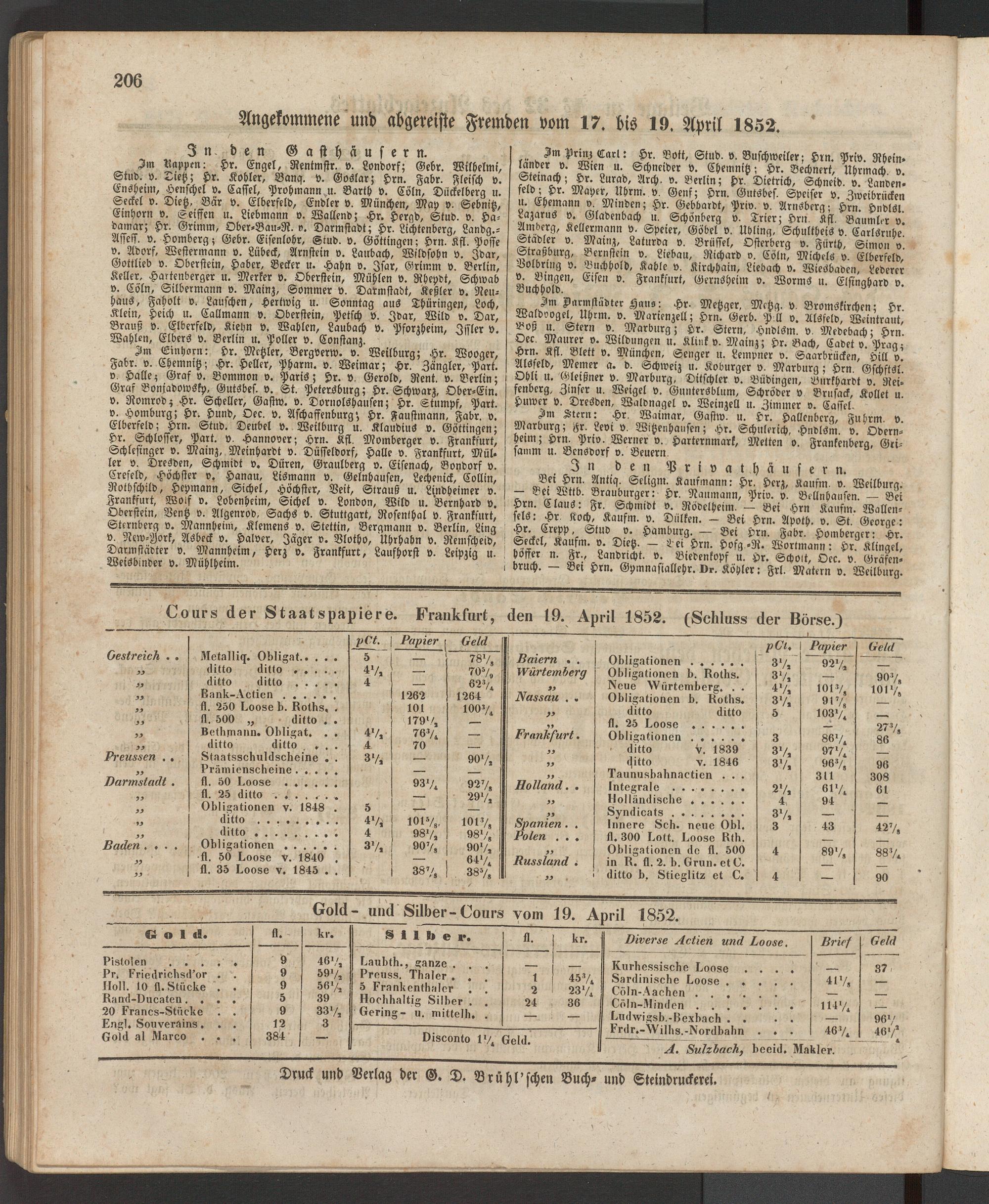 Angekommene und abgereiste Fremden vom 17. bis 19. April 1852.