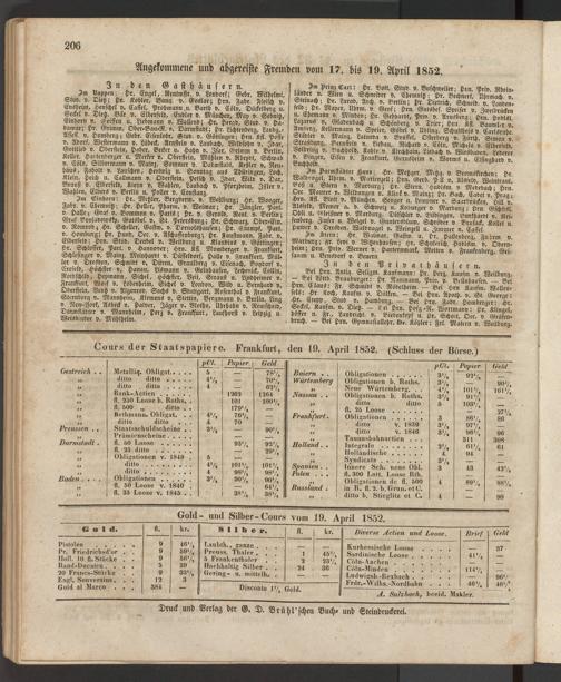 Cours der Staatspapiere. Frankfurt, den 19. April 1852. (Schluss der Börse.)