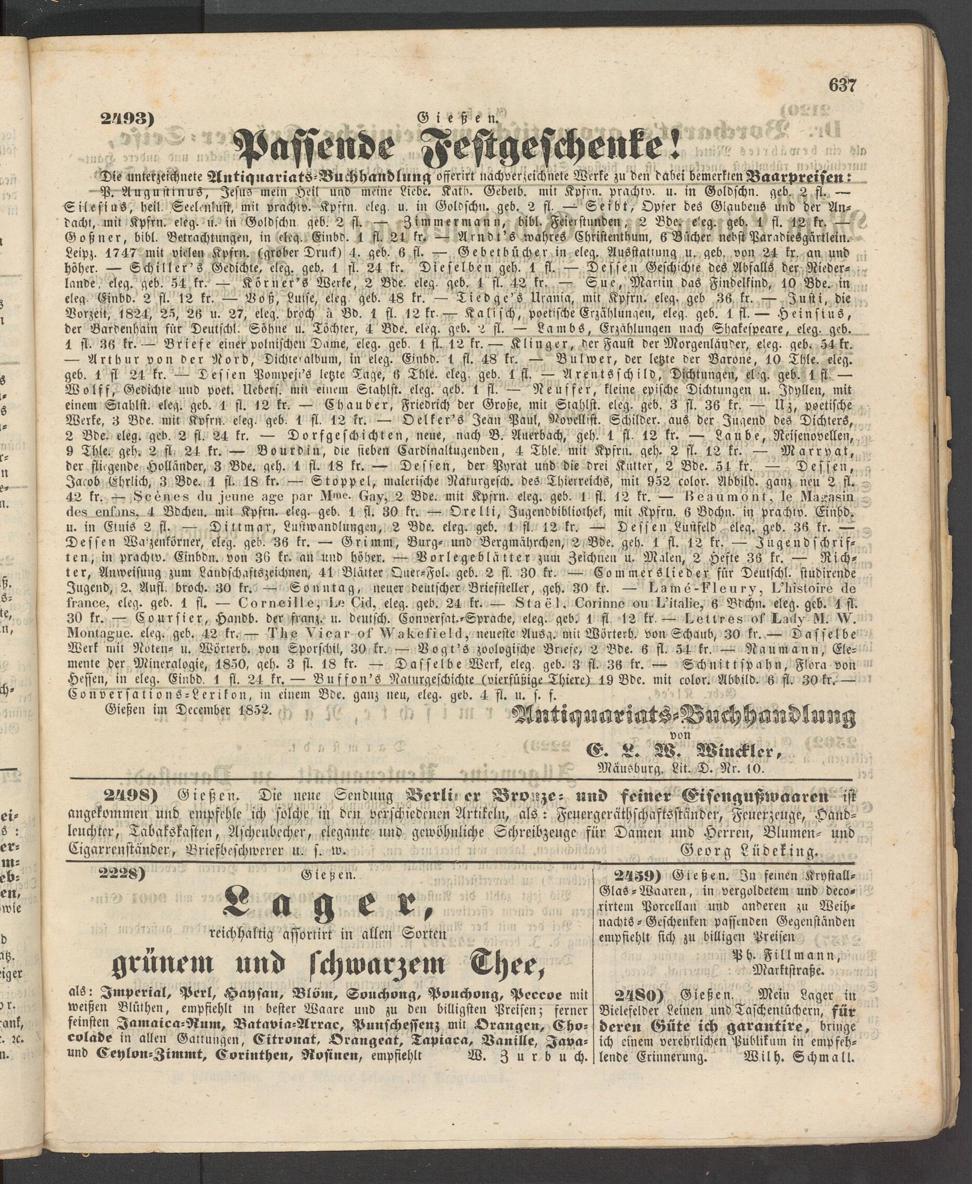 2459) Gießen. In feinen Krystall- Glas -Waaren, in vergoldetem und deco- rirtem Porcellan und anderen zu Weih- nachts-Geschenken passenden Gegenständen empfiehlt sich zu billigen Preisen