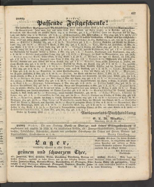 2480) Gießen. Mein Lager in Bielefelder Leinen und Taschentüchern, für deren Güte ich garantire, bringe ich einem verehelichen Publikum in empfehlende Erinnerung. Wilh. Schm all.