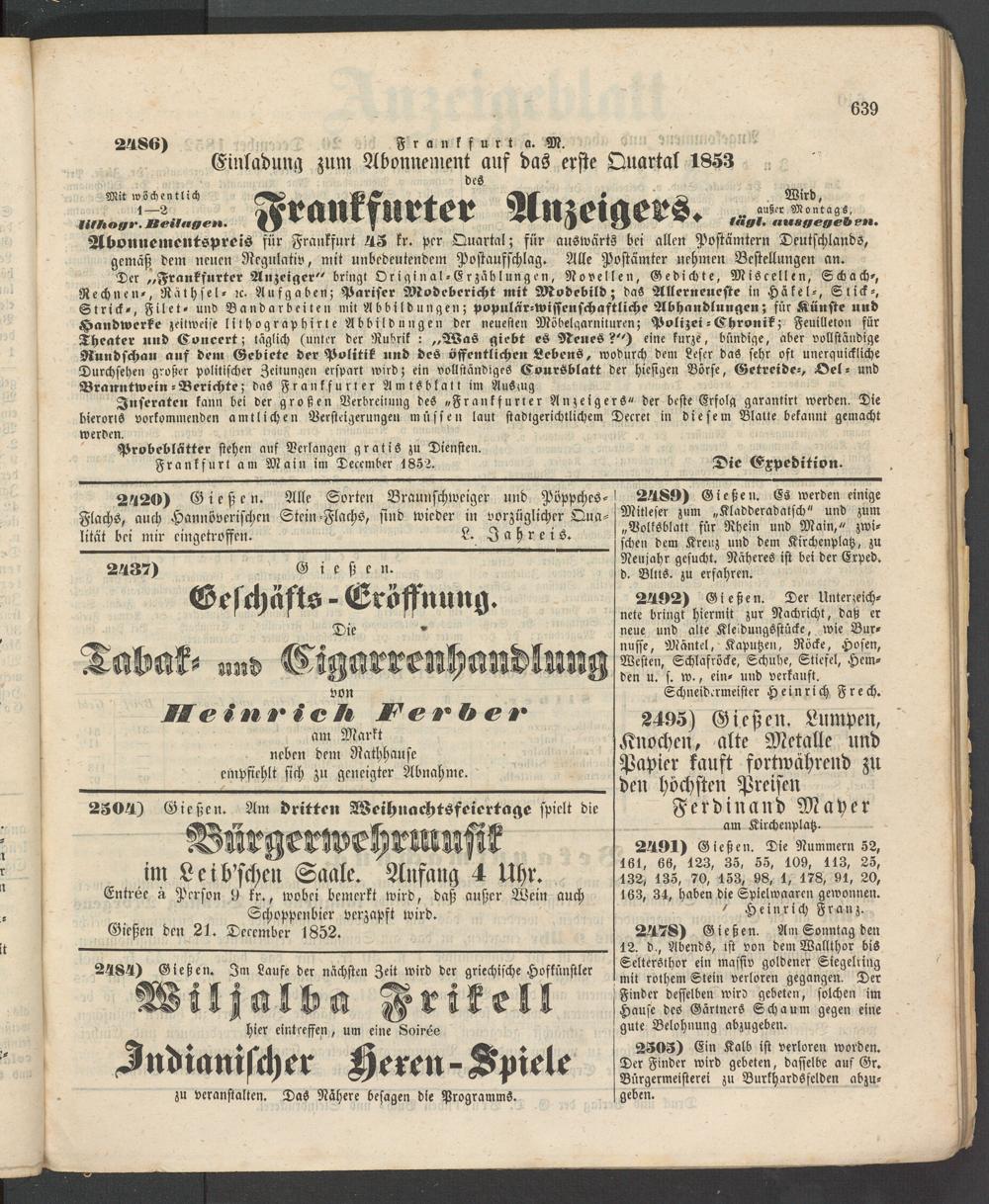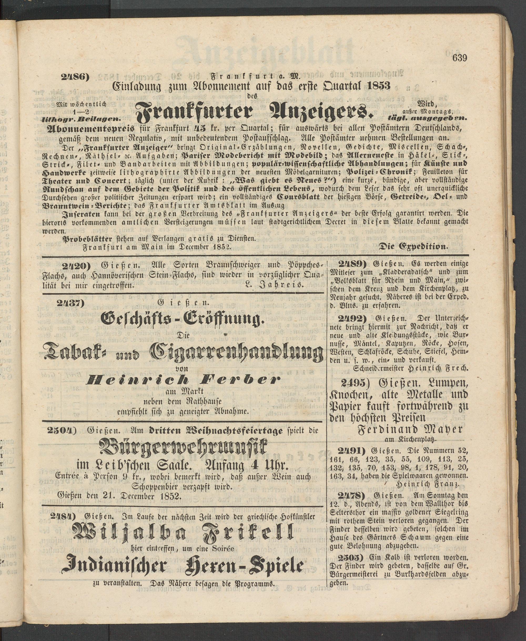 Probeblätter stehen auf Verlangen gratis zu Diensten. Frankfurt am Main im Deecmber 1852.