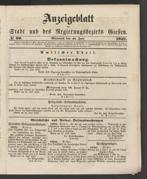 Gießen am 22. Juni 1852. Der Gr. Hess. Polizei-Commissär
