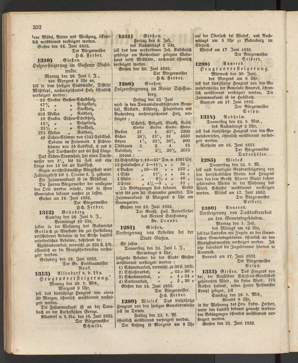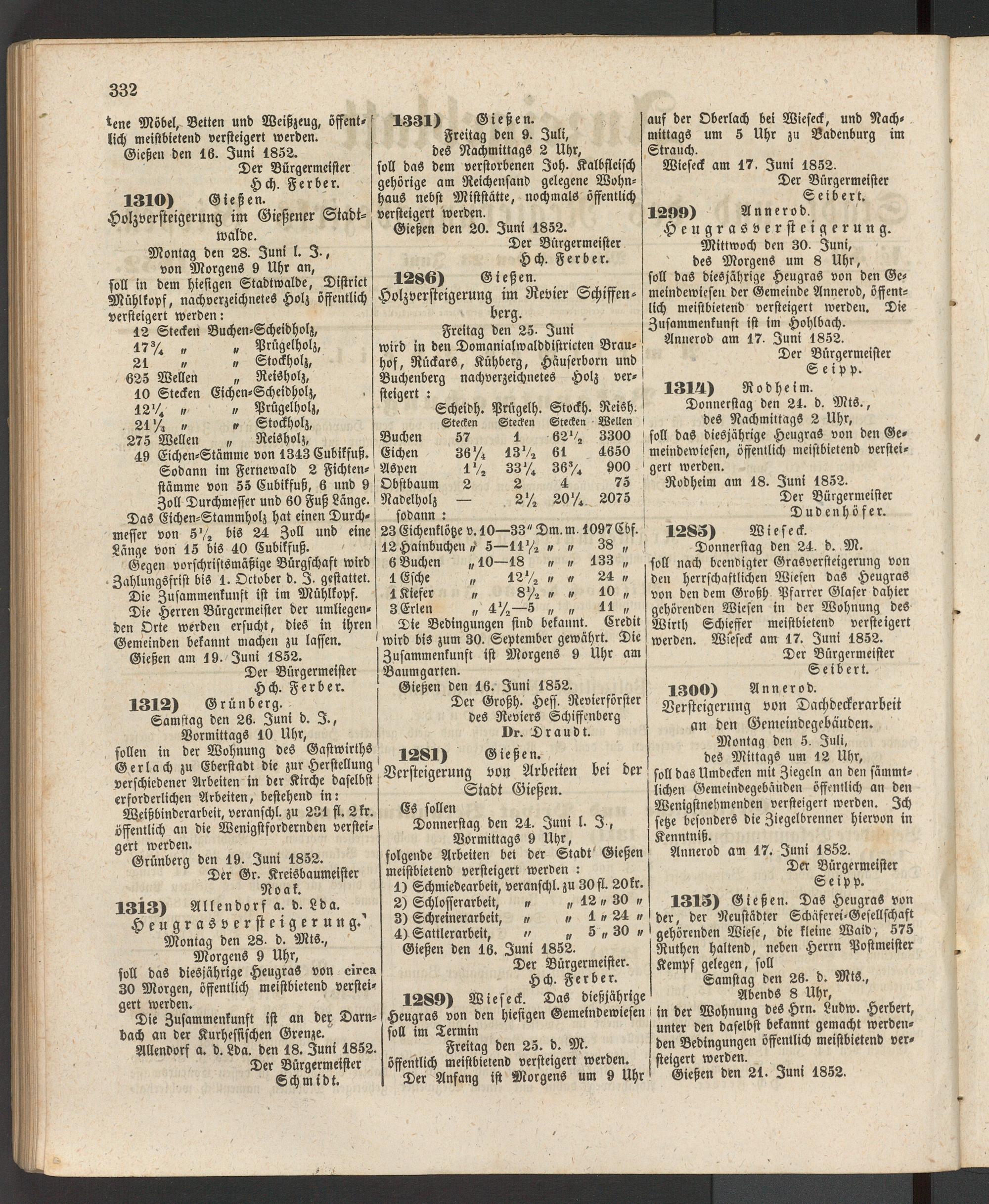 J Donnerstag den 24. d. M. soll nach beendigter Grasversteigerung von den herrschaftlichen Wiesen das Heugras von den dem Großh Pfarrer Glaser dahier gehörenden Wiesen in der Wohnung des Wirth Schiesser meistbietend versteigert werden. Wieseck am 17. Juni 1852.