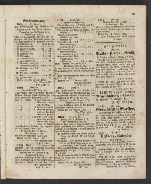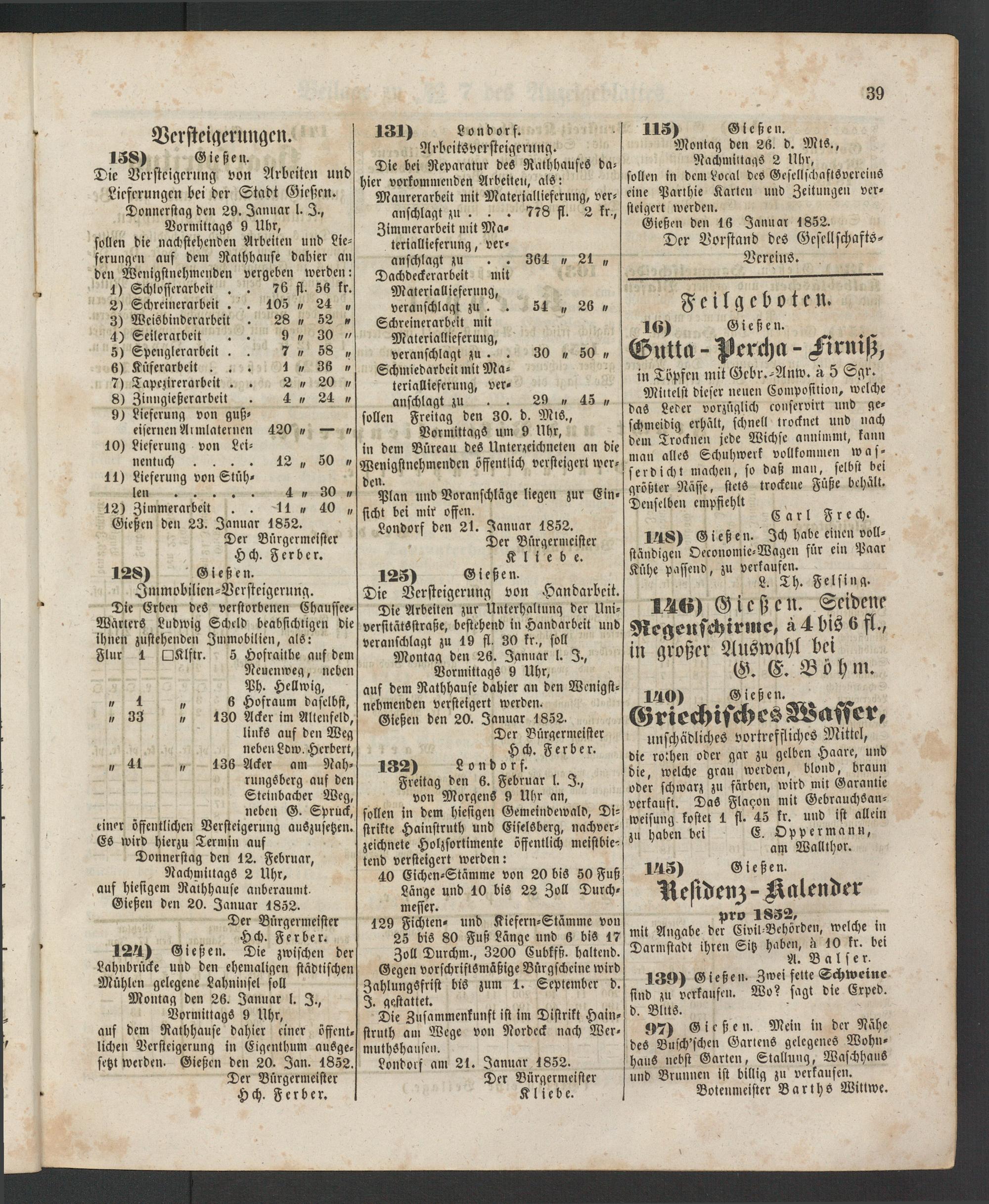 Montag den 26. Januar l. I., Vormittags 9 Uhr, auf dem Ralhhause dahier einer öffentlichen Versteigerung in Cigenthum ausgesetzt werden. Gießen den 20. Jan. 1852.