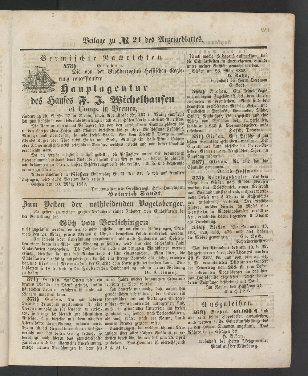 Nähere Auskunft in Gieflen Lindenplatz Lit. A. Nr. 27, so wie auf frankrrte Anfragen, wird aus's Bereitwilligste eriheilt.