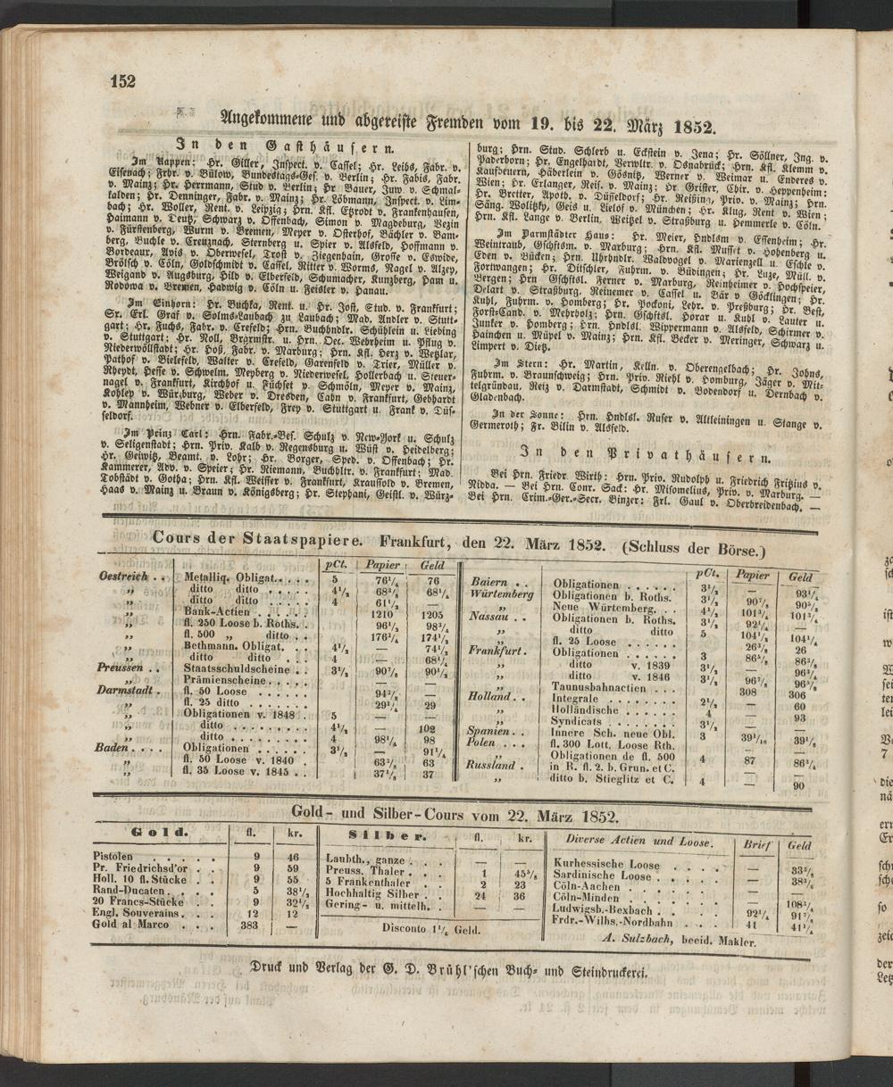 Angelommene und abgereiste Fremden vom 19. bis 22. Mär; 1852.
