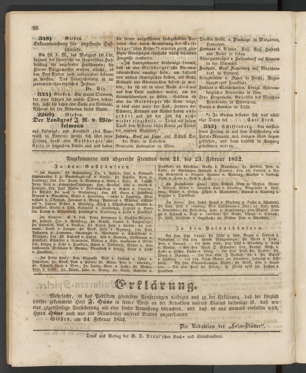 Angekommene und abgereiste Fremden vom 21. bis 23. Februar 1852.