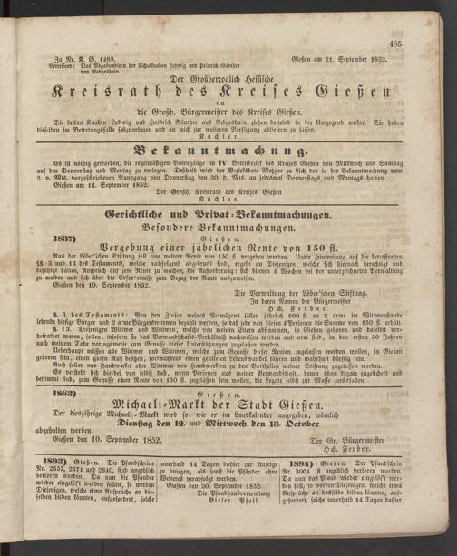 Zu Nr. K. G. 1489. Gießen am 21. September 1852.