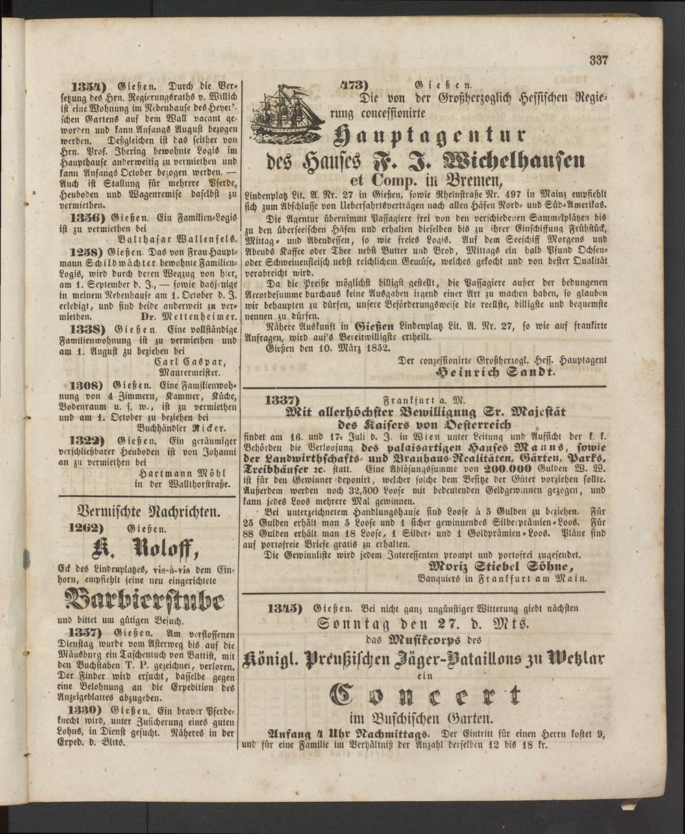 Lindenplah Lit. A. Nr. 27 in Gießen, sowie Rheinstraße Nr. 497 in Mainz emvfiehlt sich zum Abschlüsse von Ueberfahrtsverträgen nach allen Häfen Nord- und Süd-AmerikaS.