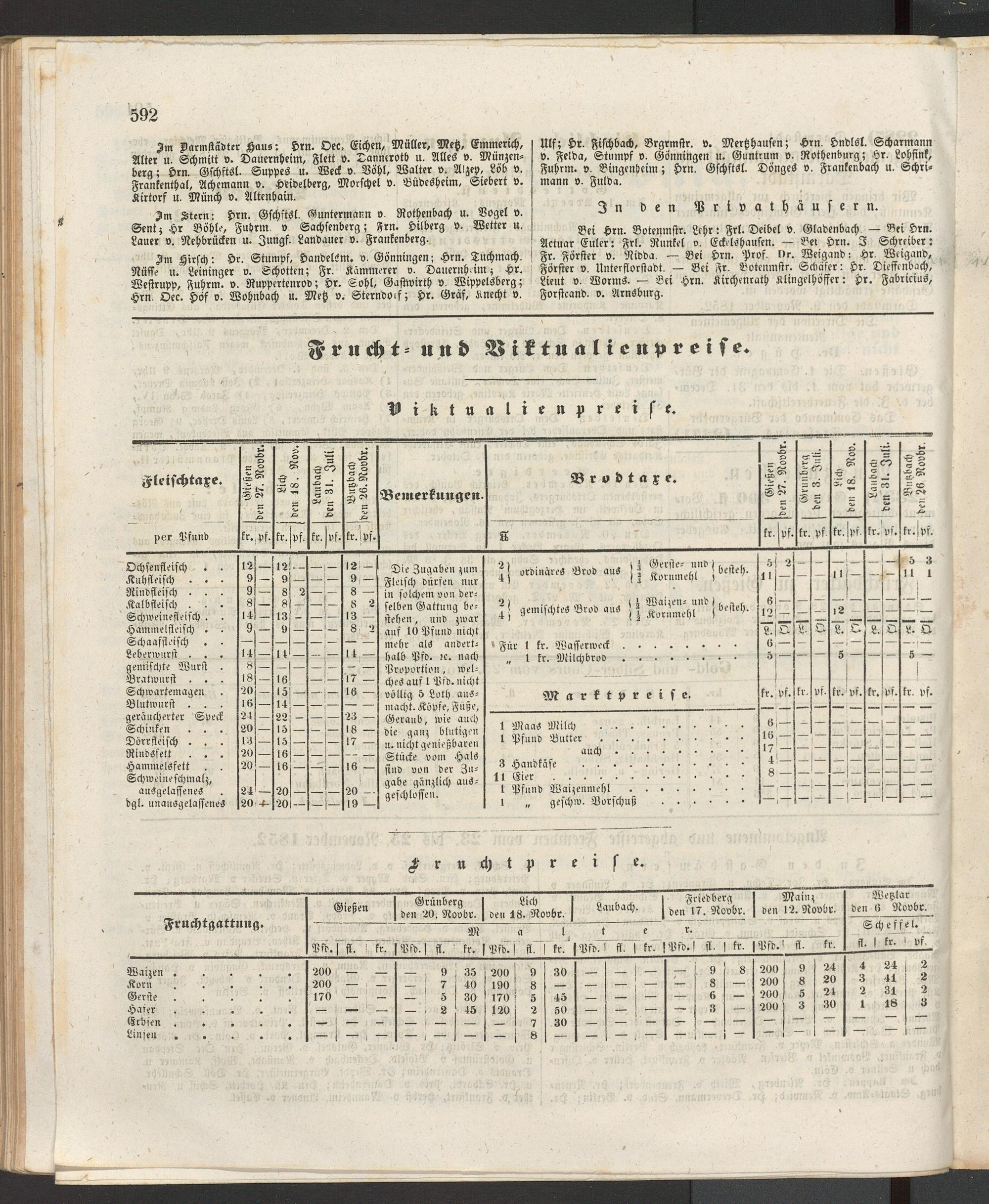 Zm Hirsch: Hr. Stumpf, Handelsm. v, Gönningen; Hrn. Tuchmach, Nüsse n. Leininger v. Schotten; Fr, Kämmerer v, Danernhsim; Hr. Westrupp, Fuhrm. v, Ruppertenrod; Hr. Sohl, Gastwirth v. Wippelsberg; Hrn. Oec. Höf v. Wohnbach u. Metz v. Sterndo-f; Hr. Gräf, Knecht v.