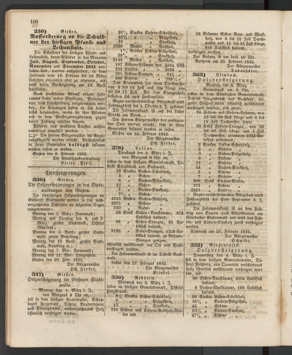 Die Diesjährigen Holzversteigerungen im Gießener Stadtwalde werden in den nachverzeichneten Distri'cten an folgenden Tagen vorgenommen: