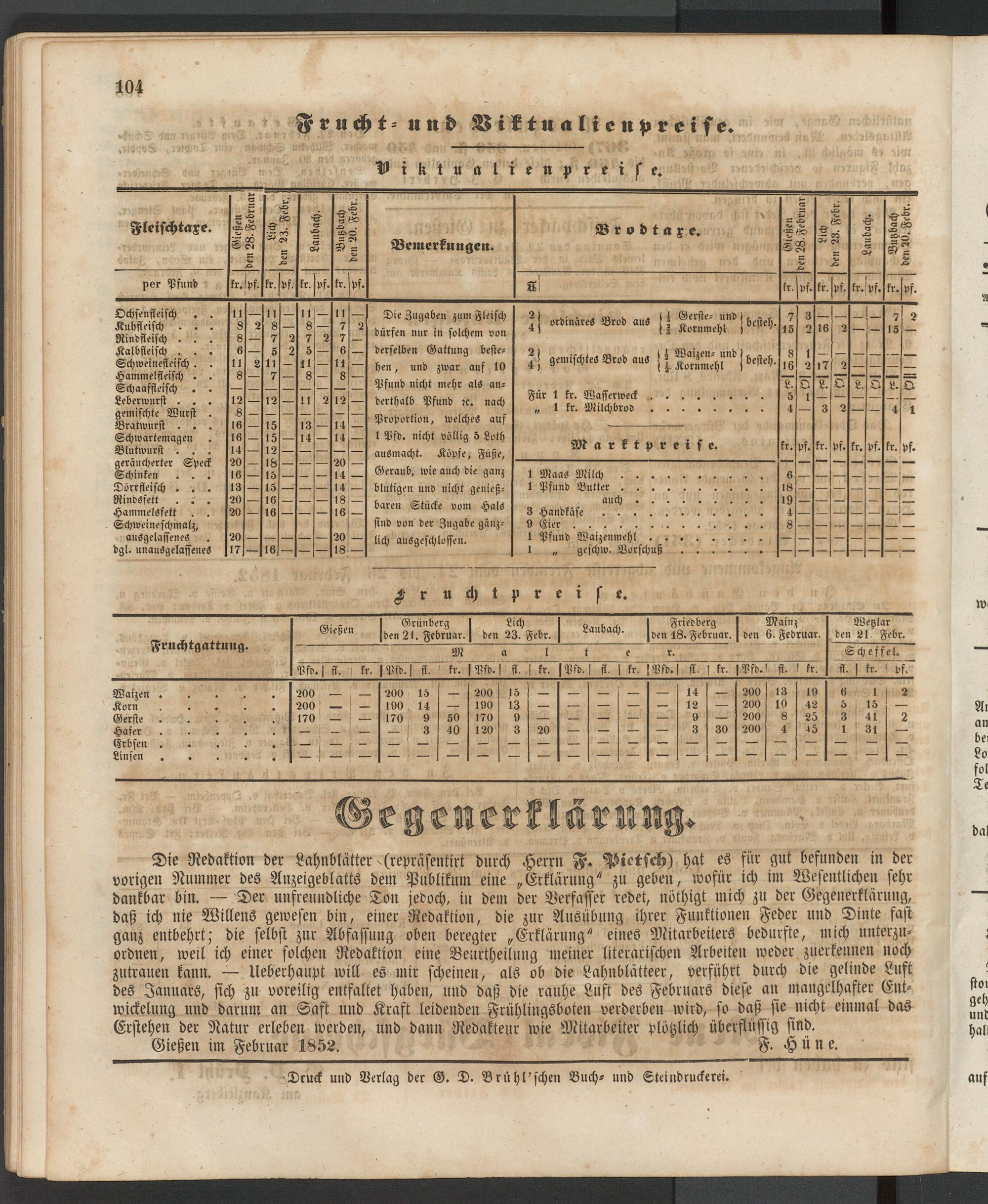 Gießen im Februar 1852. F. Hüne.