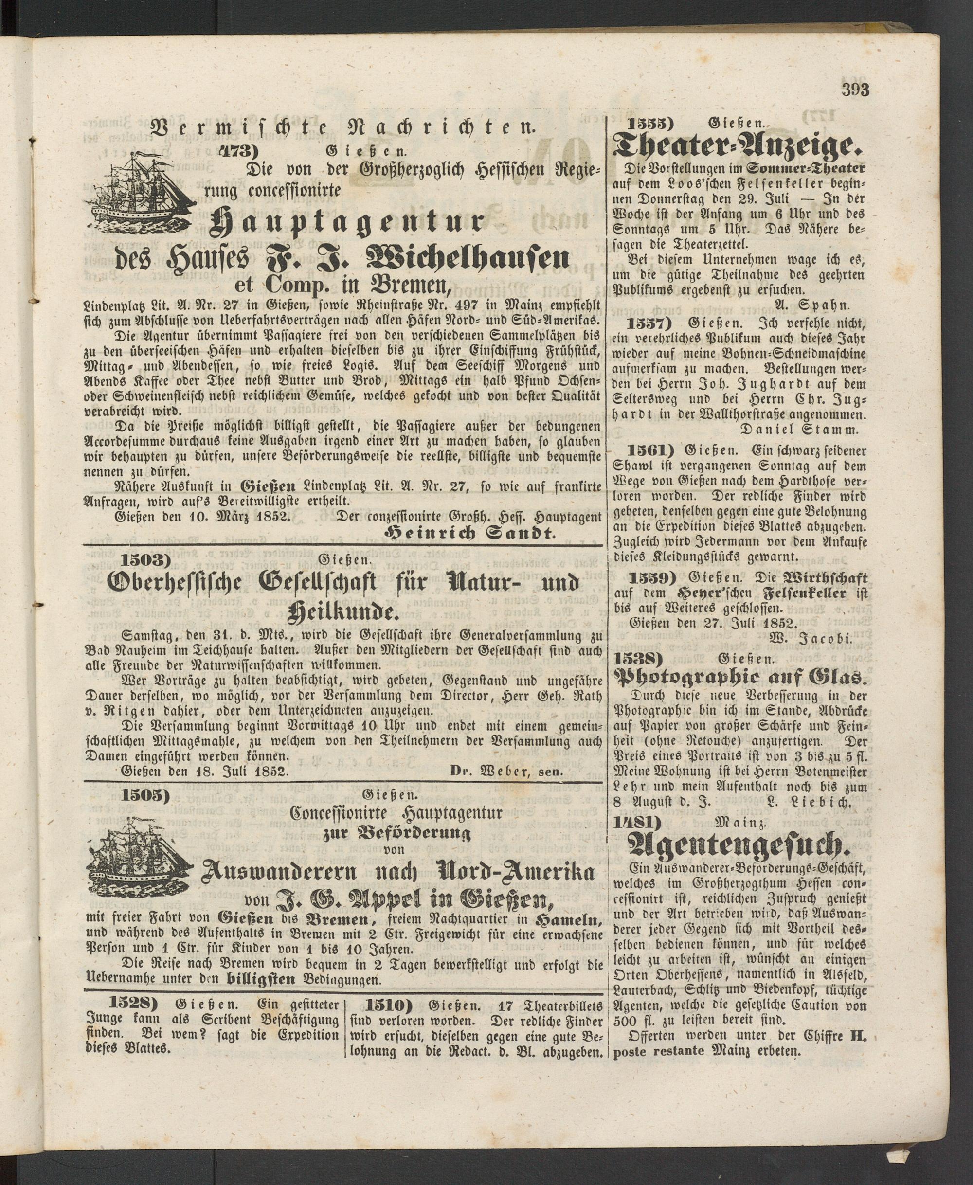 Lindenplatz Lit. 81. Nr. 27 in Gießen, sowie Rheinstraße Nr. 497 in Main; empfiehlt sich zum 8Ibschlusse von Ueberfahrtsverträgen nach allen Häfen Nord- und Süd-Amerikas.