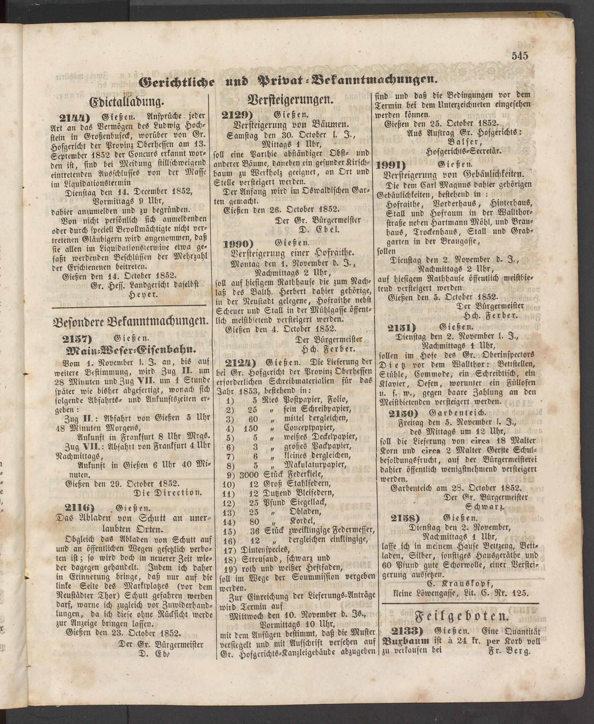 212£0 Gießen. Die Lieferung der bei Gr. Hofgericht der Provinz Oberhessen erforderlichen Schreibmaterialien für das Jahr 1853, bestellend in: