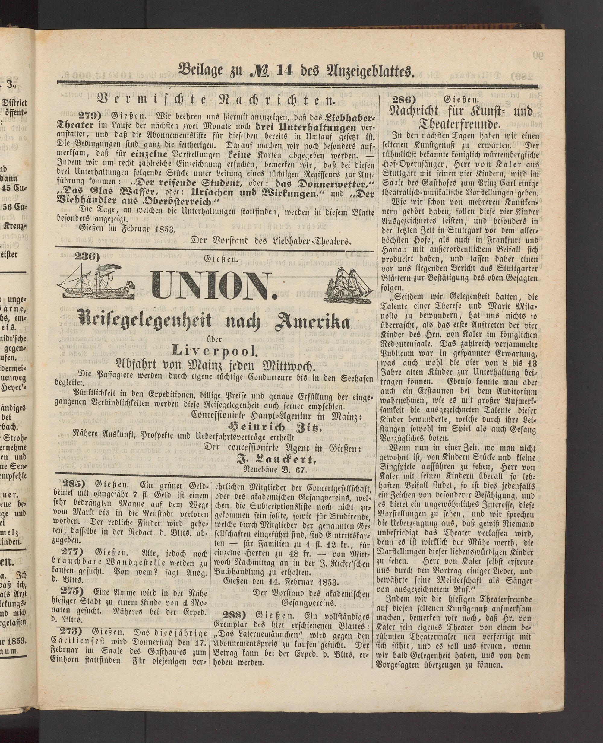 27K) Gießen. Wir beehren uns hiermit anzuzeigen, daß das Liebhaber- im Vnufe der näeinten zwei Mengte noch Itnfcr^ttltnitQCit ver- anstaltet, und daß die Abonnementsliste für dieselben bereite in Umlauf gesetzt ist. Die Bedingungen sind ganz die seitherigen. Daraus machen wir noch besonders aus- merksam, daß für einzelne Vorstellungen feilte Karten abgegeben werden. — -Jnbem wir um recht zahlreiche Ein;eichnung ersuchen, bemerken wir, daß bei diesen drei Unterhaltungen folgende Stücke unter Leitung eines tüchtigen Regisseurs zurAuf- fiibrung koU!men; „Der reisende Student, oder: das Donnerwetter," ^Das Glas Wasser, ober: Ursachen und Wirfunqen," und „Der Brey Händler aus Dberösierreich “