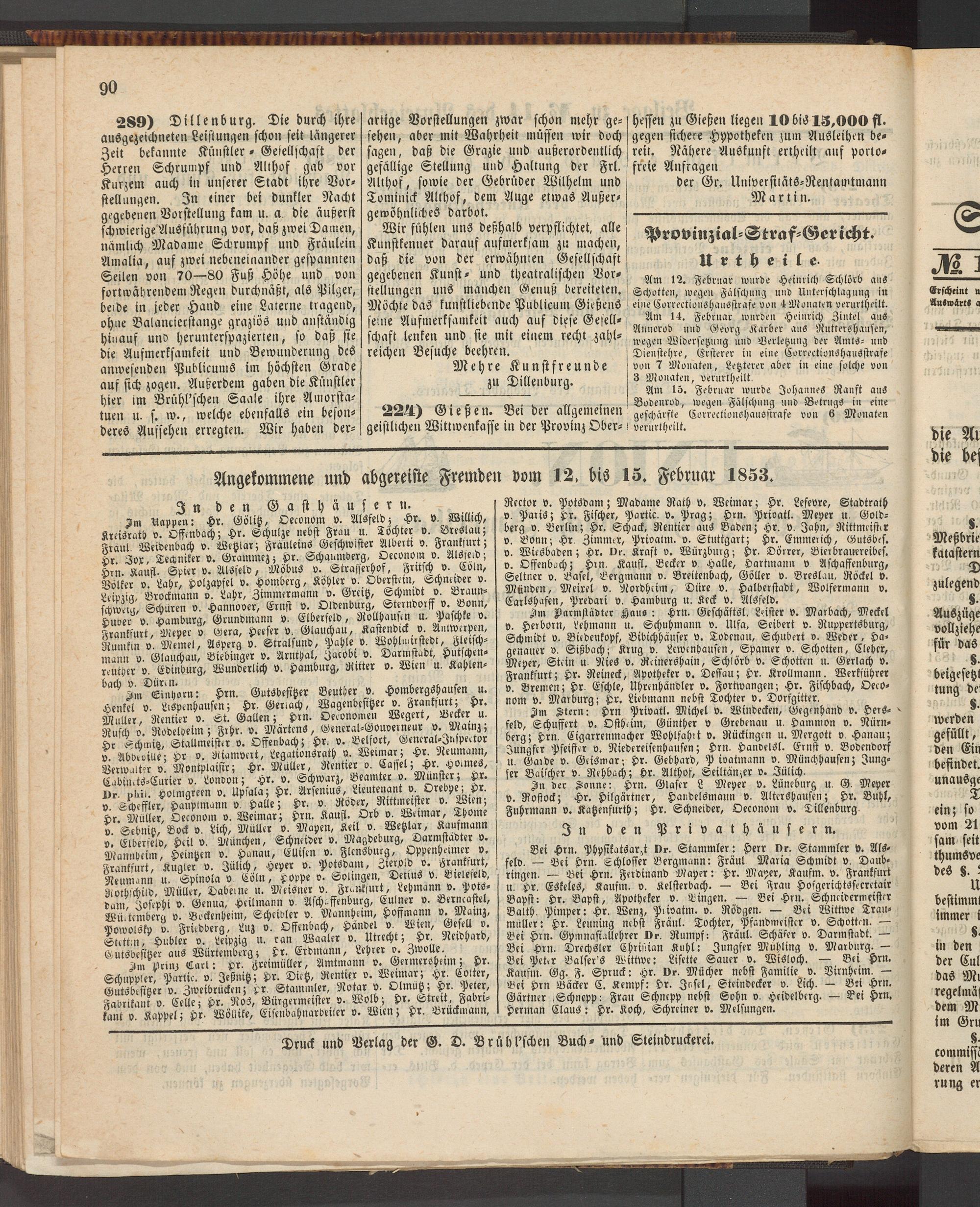 Angekommene und abgereifte Fremden vom 12, bis 15. Februar 1853.