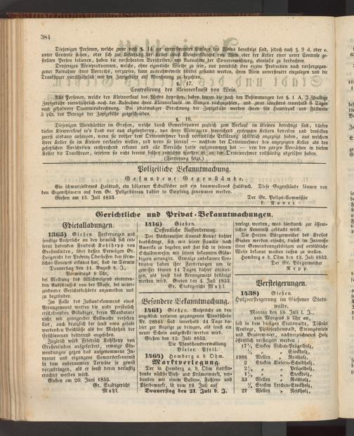 Gießen am 15. Juli 1853. Der Gr. Polizei-Commissär