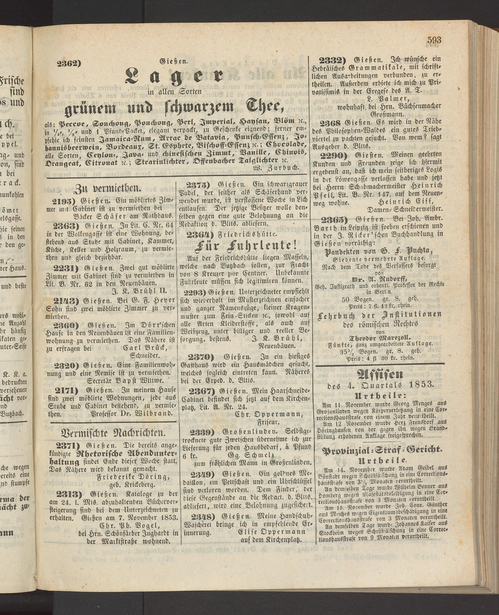 2313) Gießen. Kataloge zu der am 24. 1. Mls. abzuhaltenden Bücherver- steigerung sind bei dem Unterzeichneten zu erhalten. Gießen am 7. November 1853.