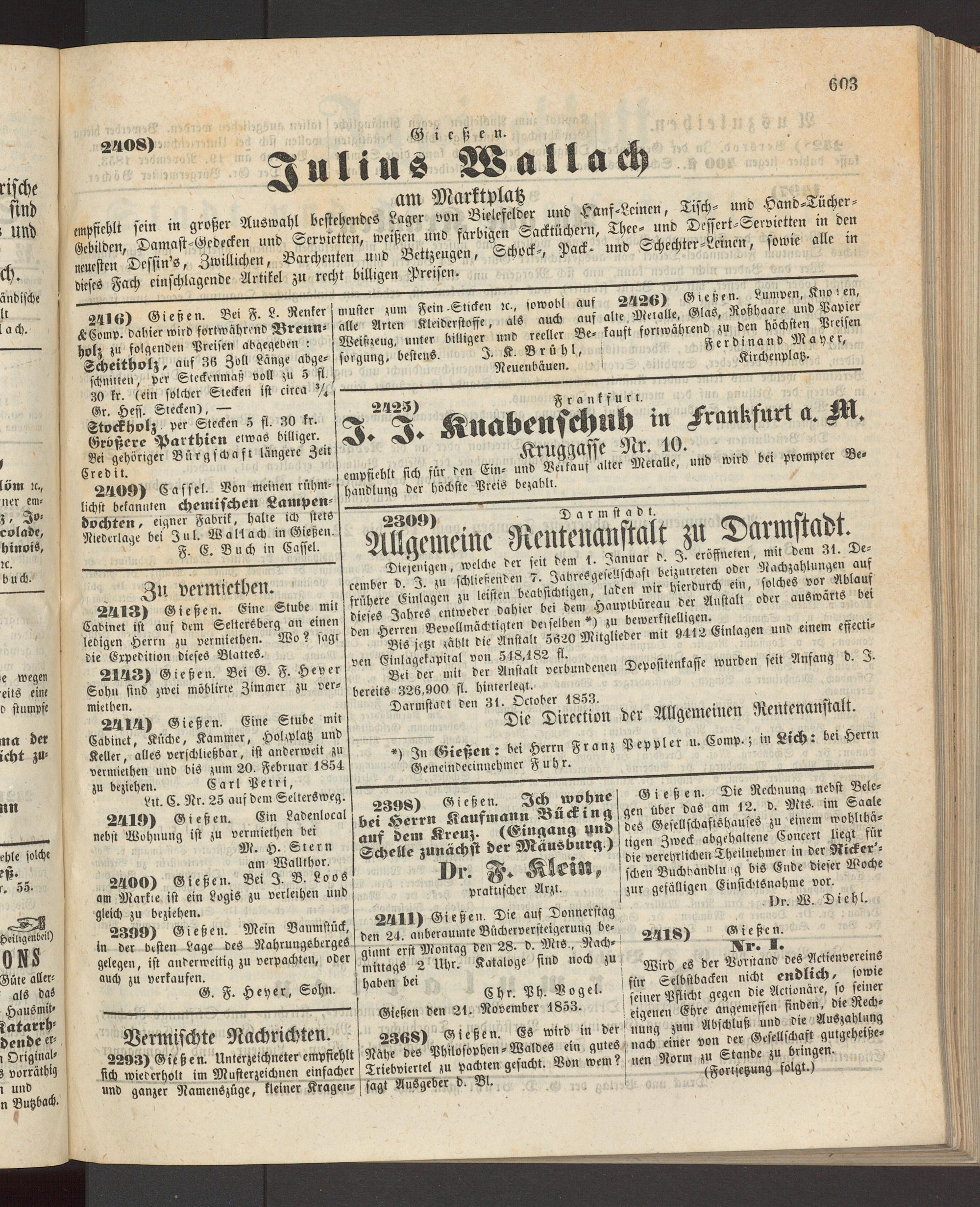 2409) Cassel. Von meinen rühmlichst bekannten chemischen Lampen- dochten, eigner Fabrik, halte ich stets Niederlage bei Jul. Wallach in Gießen. F. E. Buch in Caffel.