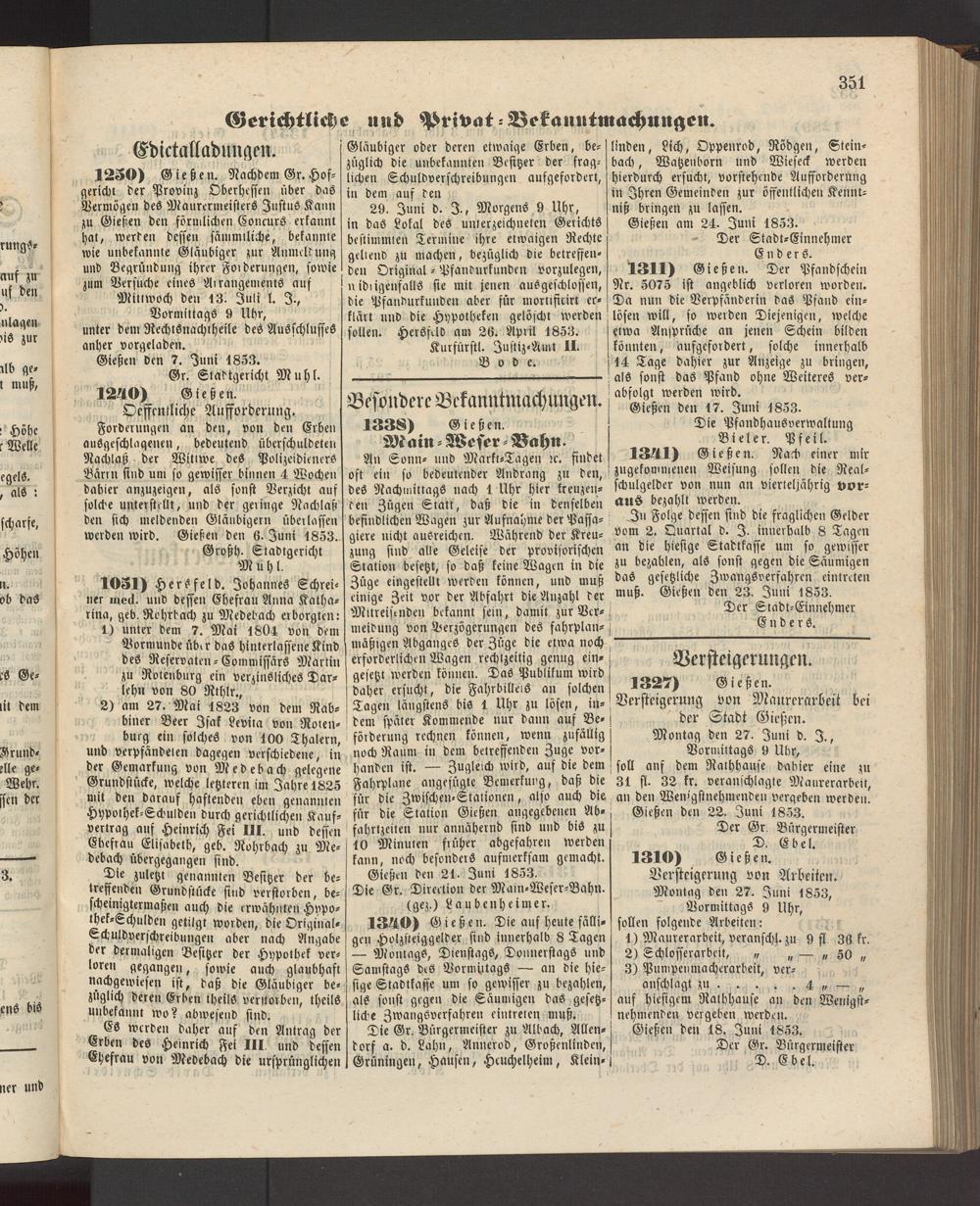 Forderungen an den, von den Erben ausgeschlaqenen, bedeutend überschuldeten Nachlaß der Wittwe des Polizeidieners Bärin sind um so gewisser binnen 4 Wochen dahier anzuzeigen, als sonst Verzicht auf solche unterstellt, und der geringe Nachlaß den sich meldenden Gläubigern überlassen werden wird. Gießen den 6. Juni 1853.