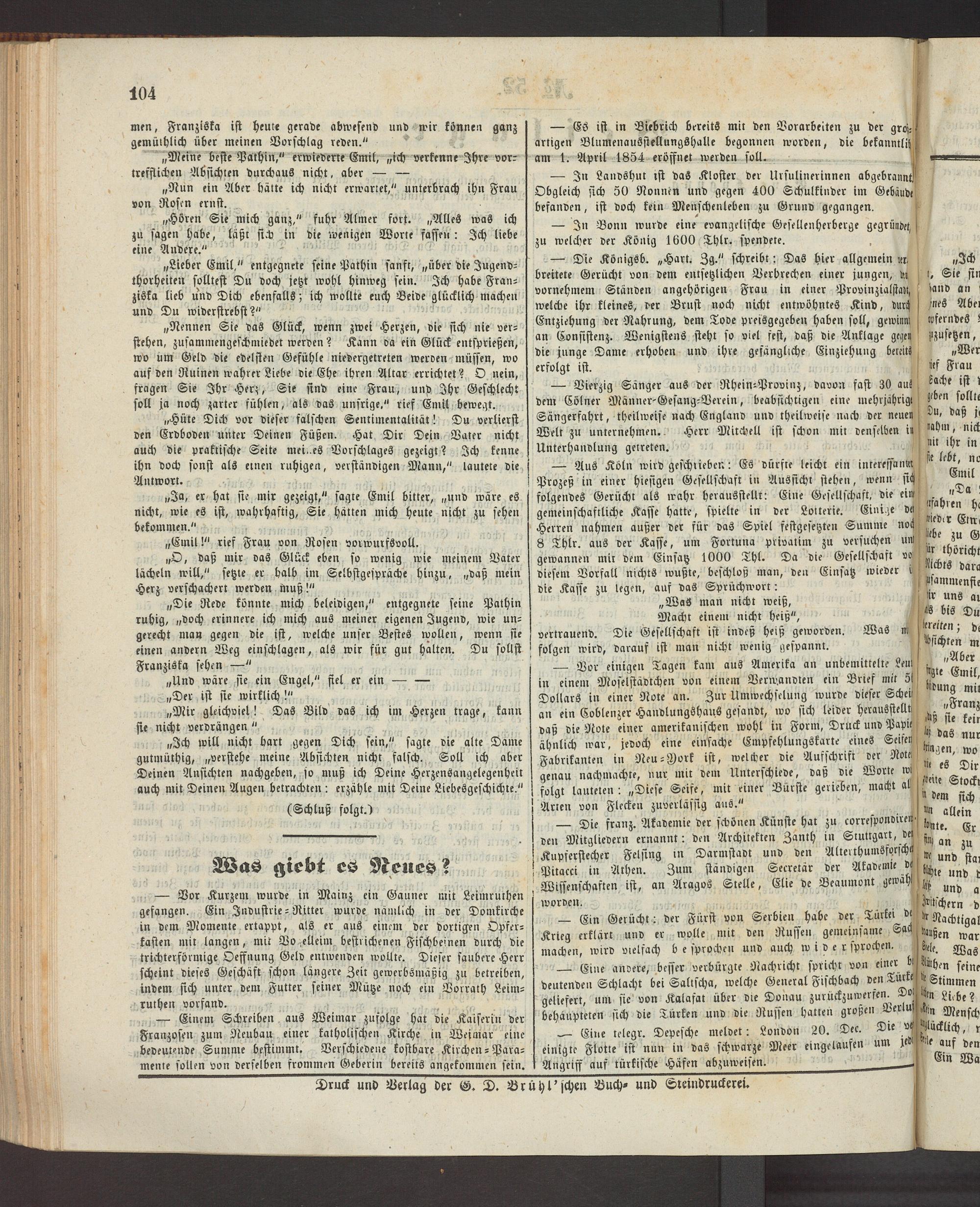 — Aus Köln wird geschrieben: Cs Dürfte leicht ein interessant« Prozeß in einer hiesigen Gesellschaft in Aussicht stehen, wenn sich folgendes Gerücht als wahr herausstellt: Eine Gesellschaft, die ein gemeinschaftliche Kasse hatte, spielte in Der Lotterie. Einige D« Herren nahmen außer Der für Das Spiel festgesetzten Summe noch 8 Thlr. aus Der Kaffe, um Fortuna privatim zu versuchen uni gewannen mit Dem Einsatz 1000 Thl. Da Die Gesellschaft vo diesem Vorfall nichts wußte, beschloß man, den Einsatz wieder «