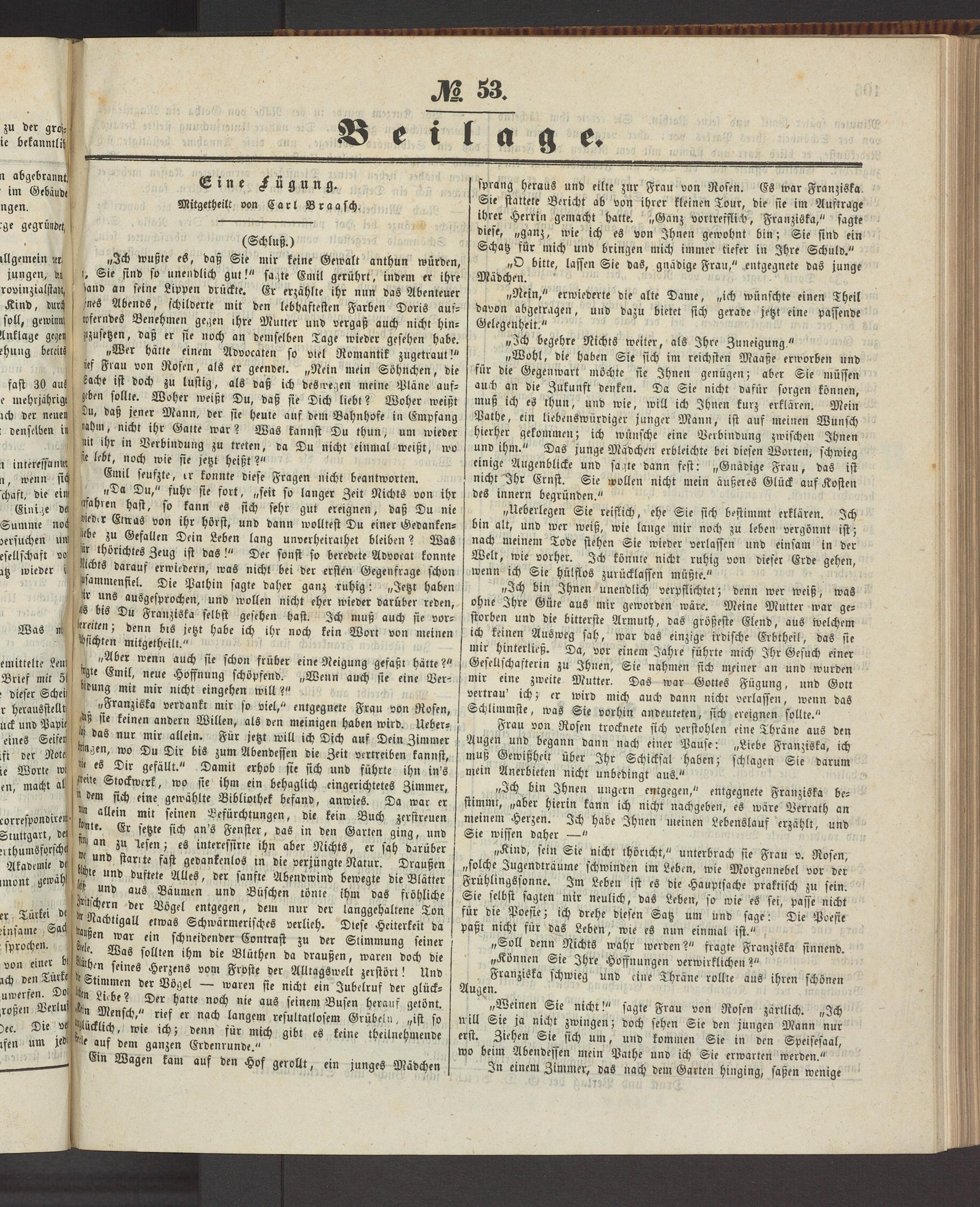 „Ich bin Ihnen unendlich verpflichtet; denn wer weiß, was ohne ^hre Güte aus mir geworden wäre. Meine Mutter war gestorben und die bitterste Armuth, das größeste Elend, aus welchem ich keinen Ausweg sah, war das einzige irdische Erbtheil, das sie mir hinterließ. Da, vor einem Jahre führte mich Ihr Gesuch einer Gesellschafterin zu Ihnen, Sie nahmen sich meiner an und wurden mir eine zweite Mutter. Das war Gottes