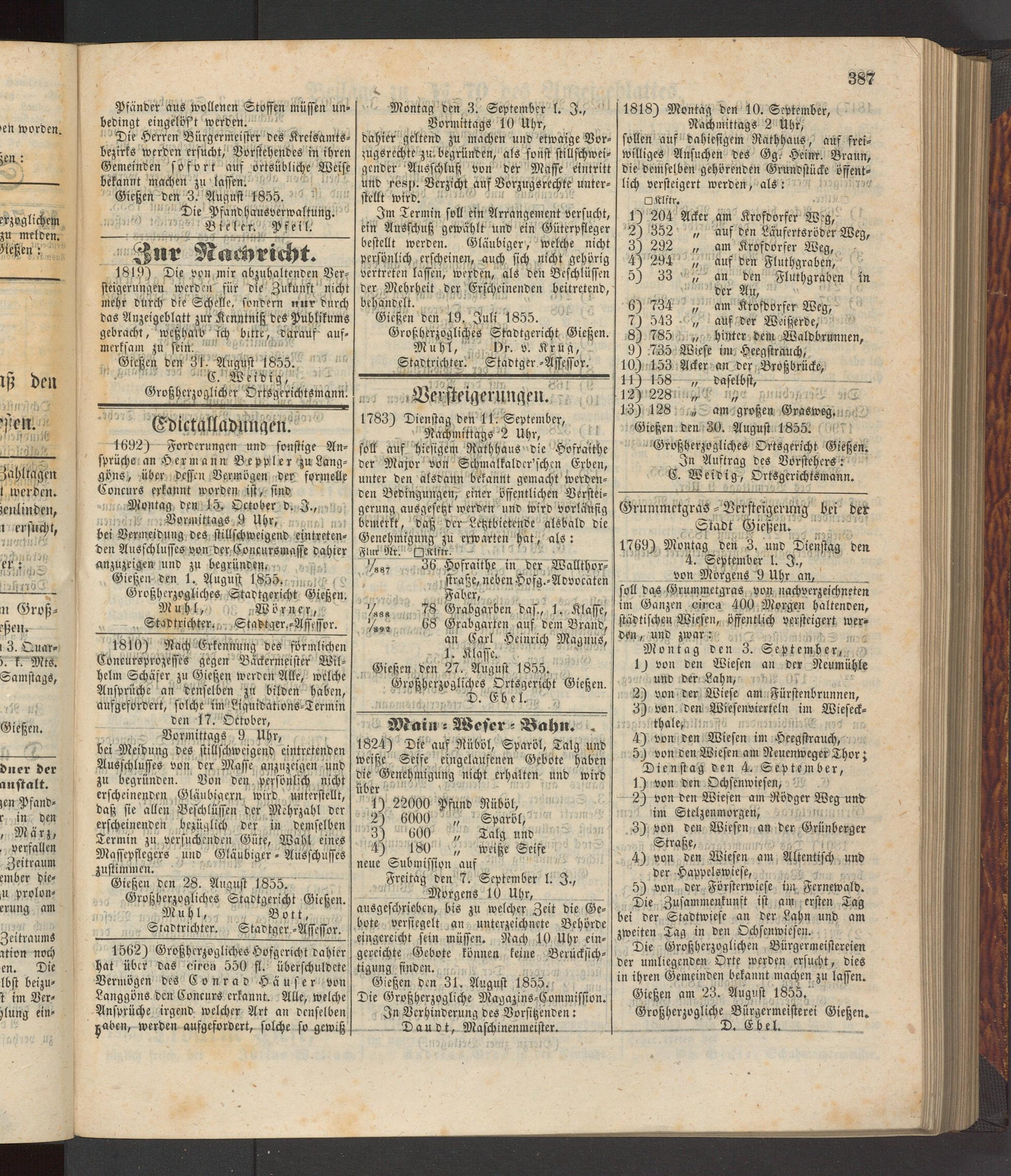 Gießen den 27. August 1855. Großherzogliches Ortsgericht Gießen. D. Ebel.