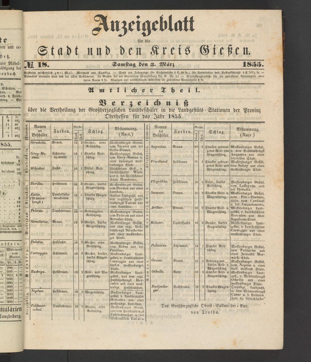über die Vertheilung der Großherzoglichen Landbeschäler in die Landgestüts - Stationen der Provinz