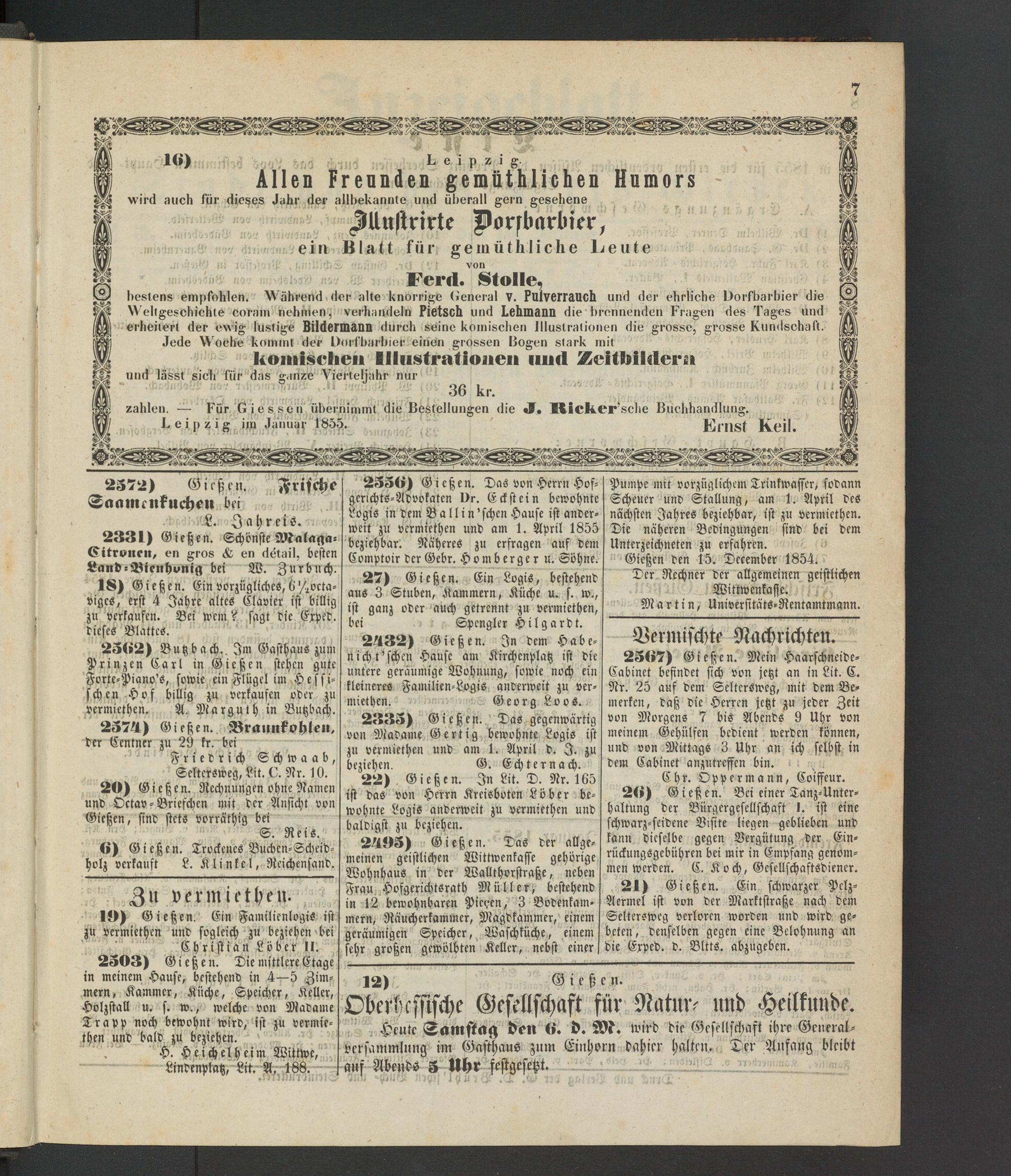 2307) Gießen. Mein Haarschneide- Cabinet befindet sich von jetzt an in Lit. C. Nr. 25 auf dem Seltcrsweg, mit dem Bemerken, daß die Herren jetzt zu jeder Zeit von Morgens 7 bis Abends 9 Uhr von meinem Gehülfen bedient werden können, und von Mittage 3 Uhr an ich selbst in dem Cabinet anzutreffcn bin.