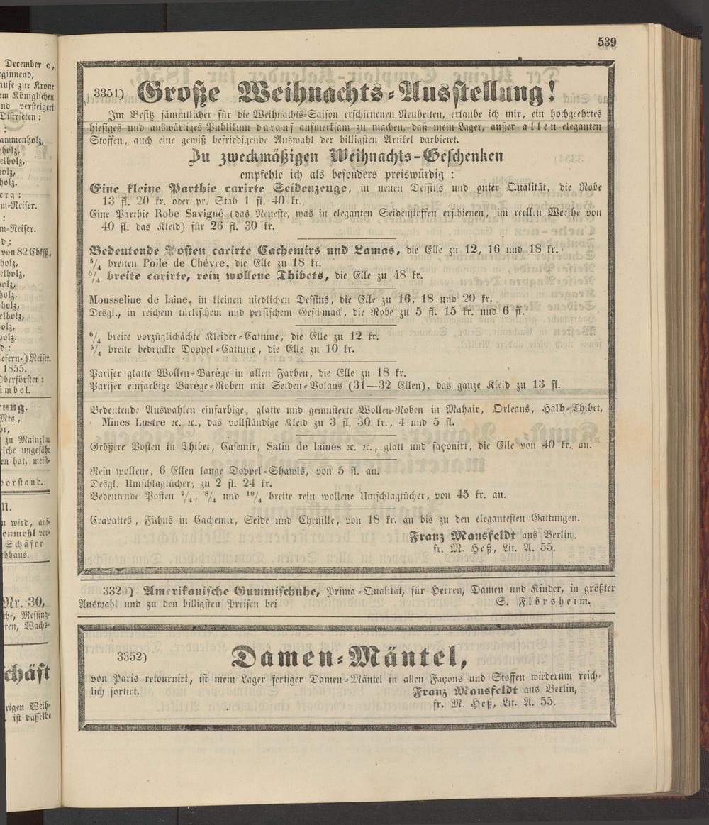 von Paris retournirt, ist mein Lager fertiger Damen-Mäntel in allen Fatous und Stoffen wiederum reich lich sortirt. Franz Mansfcldt ans Berlin,
