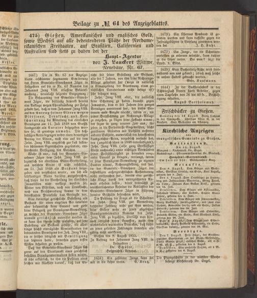 Johs. Jung Vlll. aber, der natürlich keine Schonung zu haben braucht gegen Jemanden, dem er seit Jahren sein ganzes Vermögen anvertraut hat, der dieses Vertrauen aufs Aergste täuscht, indem er, um seiner Verpflichtung zur Rechnungs-Ablage zu entgehen, zu Lügen seine Zuflucht nimmt; der sogar in ganz neuerer Zeit aus, für jeden in die Verhältnisse Eingeweihten, leicht greifbaren Gründen mit Beihülfe mehrerer anderer Subjecte, ausweislich der betreffenden Landgerichts-Acten, vergeblich versucht hat, den (angeblich schon in 1848 entmündigten), Johs. Jung Vlll. (also ganz überflüssiger Weise nochmals) unter nichtigen Vorwänden seiner Selbstständigkeit zu berauben resp. unter Curatel zu bringen, verlangt, indem er seine Vermögens-Verwaltung zu eigenen Händen nimmt, Rechnungstellung, und hat, da der Gemeinde - Einnehmer Jäger der deßfallsigen außergerichtlichen Aufforderung nicht entsprochen hat, bereits eine gerichtliche Klage durch den unterzeichneten Anwalt erheben lassen, deren demnächst zu veröffentlichendes Resultat die Redlichkeit des Gemeinde-Einnehmers Jäger in Führung sremder Geschäfte beleuchten wird.