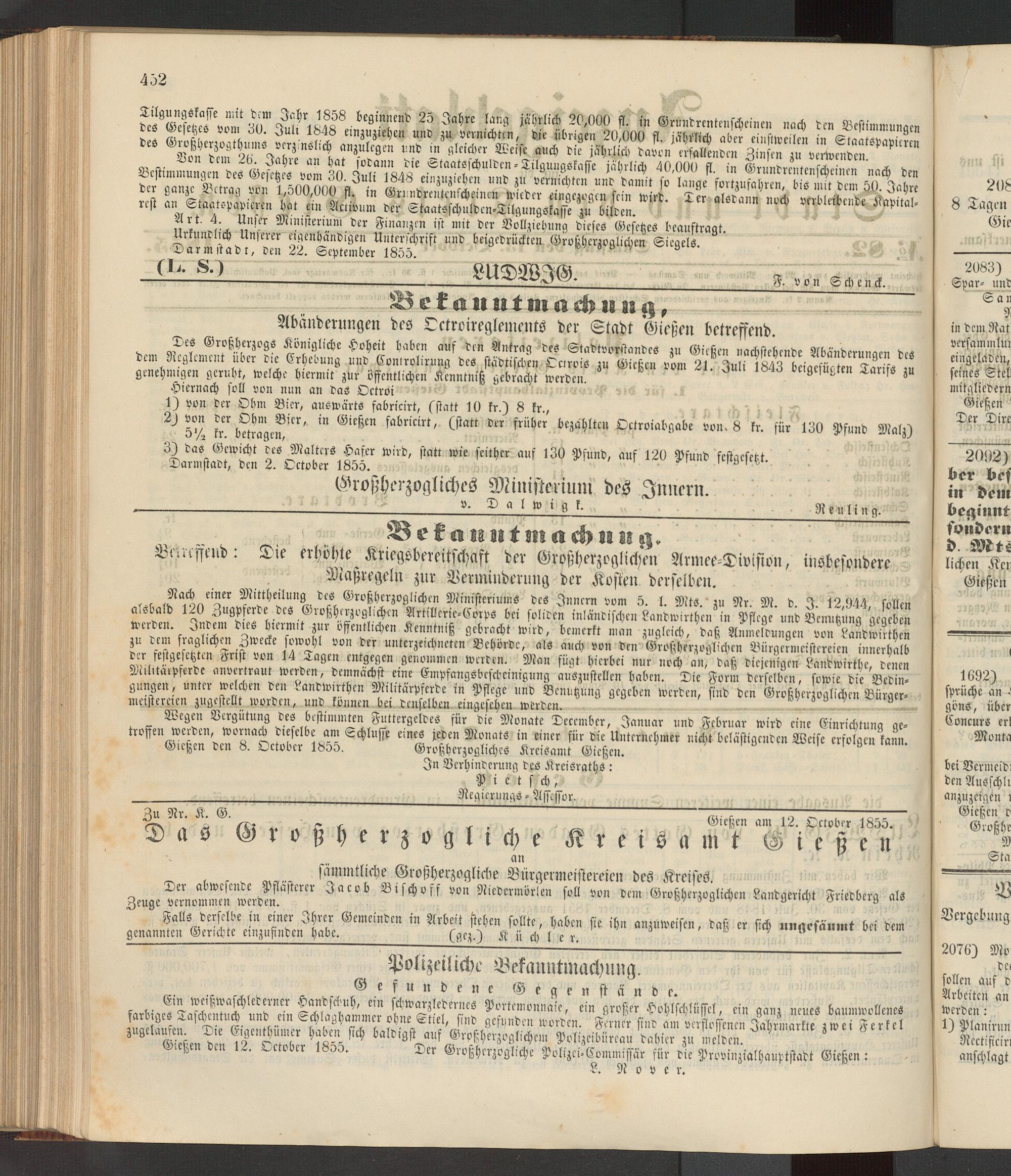 Gießen den 8. October 1855. Großherzoglichcs Kreisamt Gießen. ' 8
