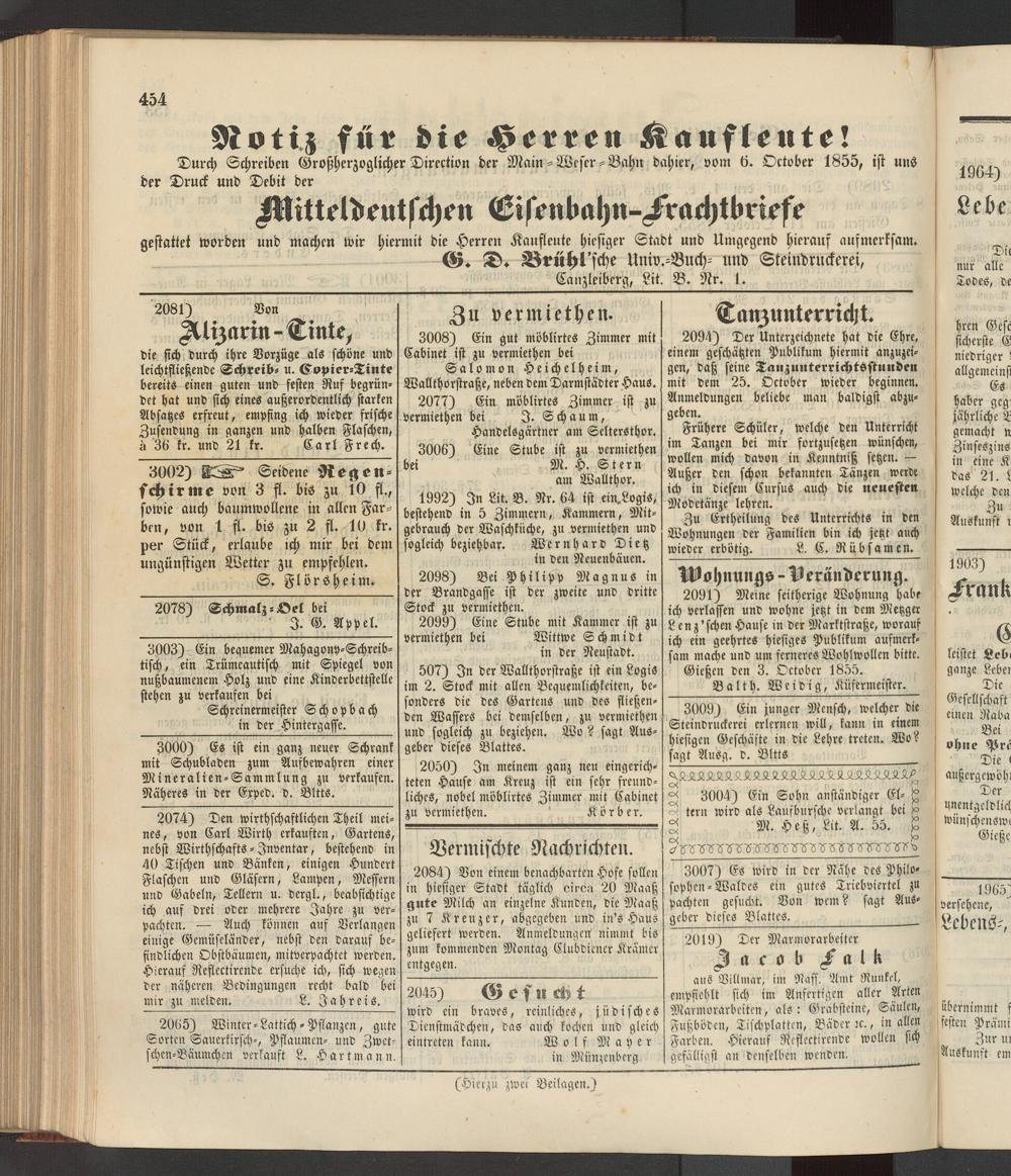 Durch Schreiben Großherzoglicher Direction der Main-Weser-Bahn dahier, vom ö. Oetober 1855, ist uns der Druck und Debit der