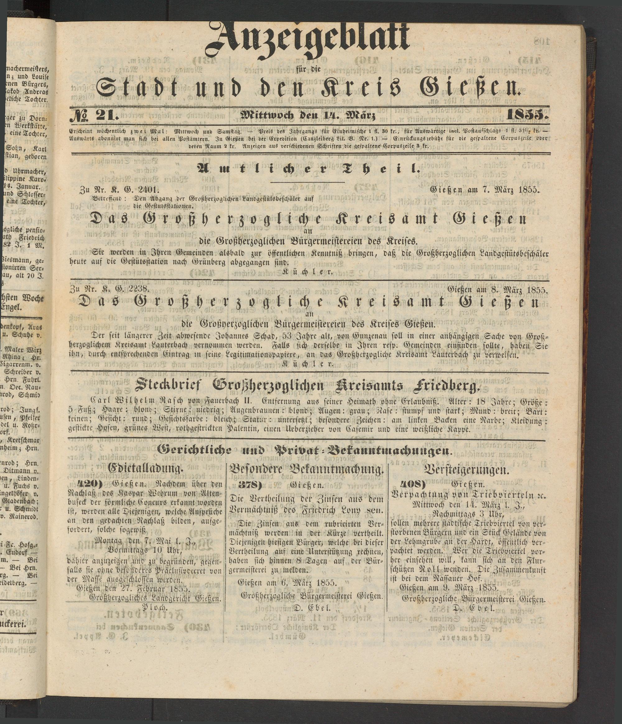 Erscheint wöchentlich zwei Mal: Mittwoch und Samstag. — Preis des Jahrgangs für Einheimische 1 ff. 30 kr., für Auswärtige invl. Postaurschlags 1 ff; 5)1/» ft. — Auswärts abonnirt man sich bei allen Postämtern. In Gießen bei der Erpedition (Canzleiberg Lit. B. Nr. 1.) — Ginrückuugs,ebuhr für die gespaltene Corpuszeile oder deren Raum 2 kr. Anzeigen aus verschiedenen Schriften die gespaltene' Corpuszeile 3 kr.