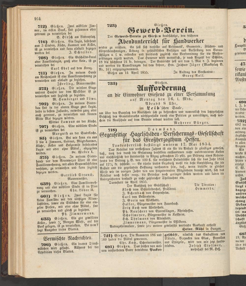 702) Gießen. In meinem Hinterbau sind in der oberen Etage zwei Logis, beide in bestem Zustande, entweder ganz oder auch getrennt, zu vermiethen und können Mitte Mai bezogen werden.