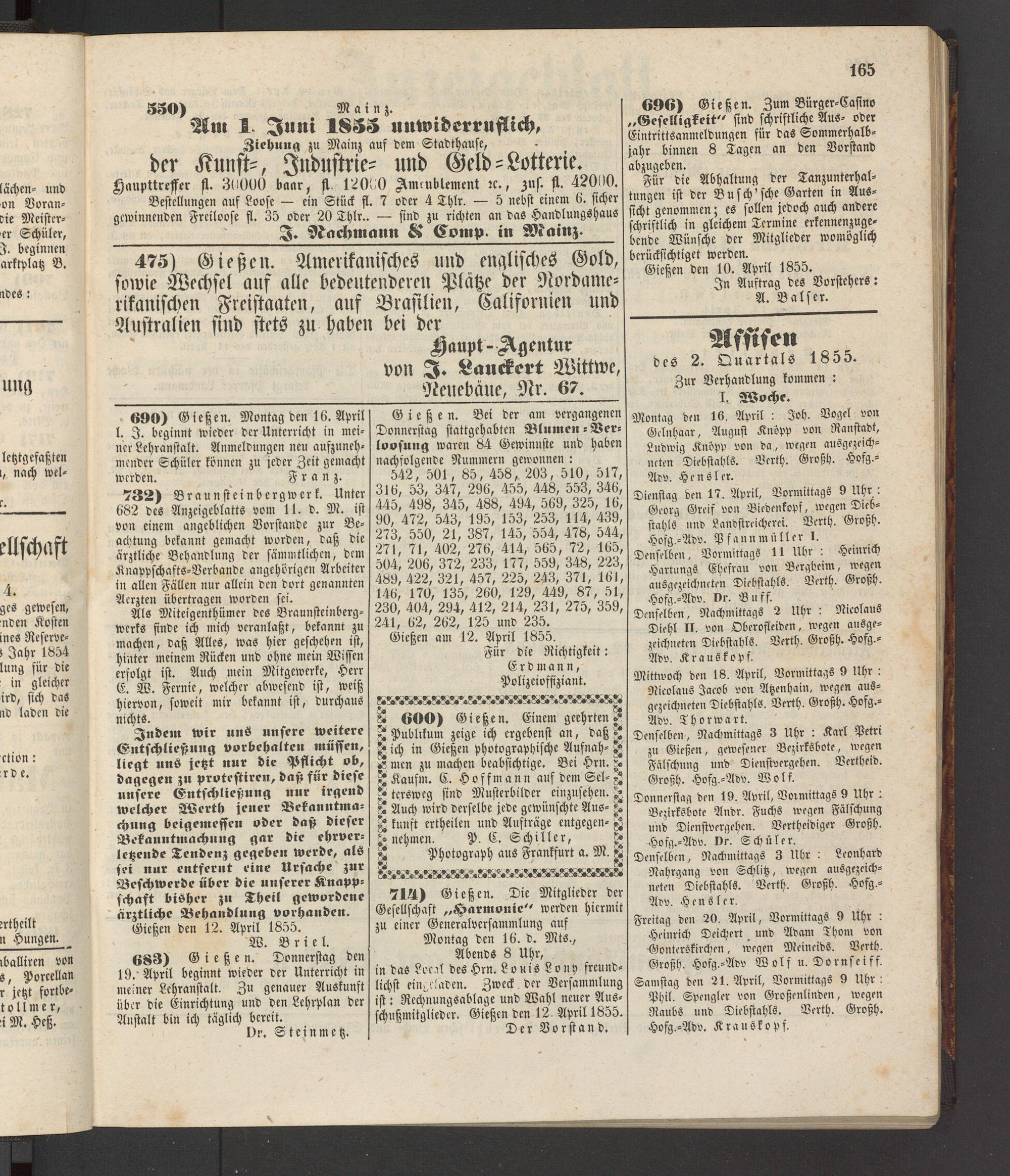 Montag den 16. April : Joh. Vogel von Gelnhaar, August Knopp von Ranstadt, Ludwig Knöpp von da., wegen ausgezeichneten Diebstahls. Verth. Großh. Hofg.- Adv. Hensler.