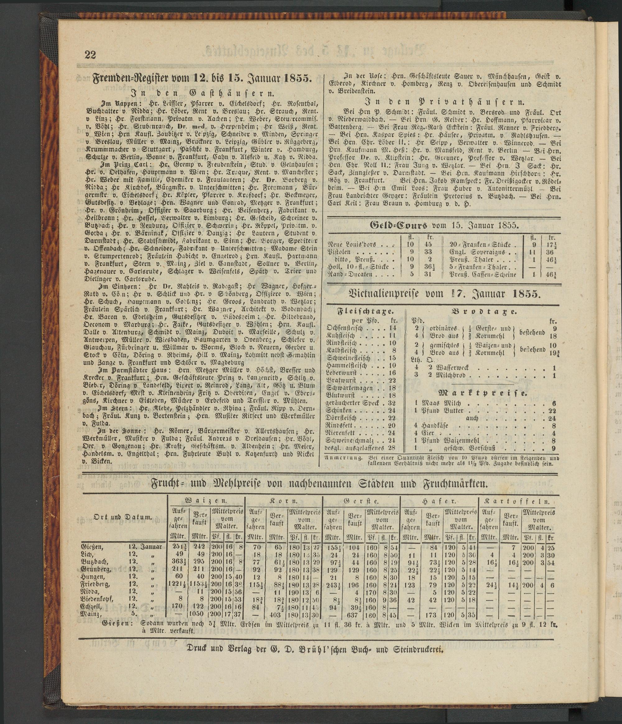 3m Rappen: Hr. Stiffler, Pfarrer v. Eichelsdorf; Hr. Rosenthal, Buchbalter ü. Nidda; Hr. Loder, Stent v. Breslau; Hr. Strauch, Stent, v Lin;; Hr. Forstmann, Privatm v. Aachen; fr, Weber, Steu.rcommis. v. Vöhl; Hr. Stubenranch, Or. med. v. Heppenheim; Hr Weiß, Stent, v Wien; Hrn Kaufl. Zaubitzer u. Leipzig, Schneider v. Minden, Springer v. Breslau, Müller v. Mainz, Bruckner v. Leipzig, Gübler v. Rüggeberg, Krummmacher v Stuttgart, Paschke v. Frankfurt , Winter v. Hamburg, Schulze v. Berlin, Bonne v. Frankfurt, Eahn v. Alsfeld n. Katz v. Ltidda.