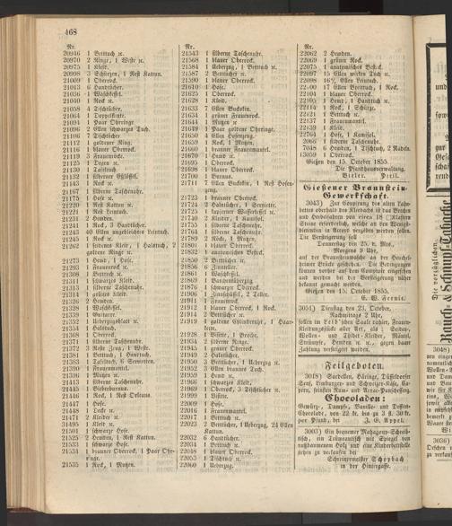 3051) Dienstag den 23. October, Nachmittags 2 Uhr, sollen im Lci b'sehen Saale dahier, Frauen- Kleidungsstücke aller Art, als : Seiden-, Wollen- und Thibet- Kleider, Mäntel, Strümpfe, Hemden rc. rc., gegen baare Zahlung versteigert werden.